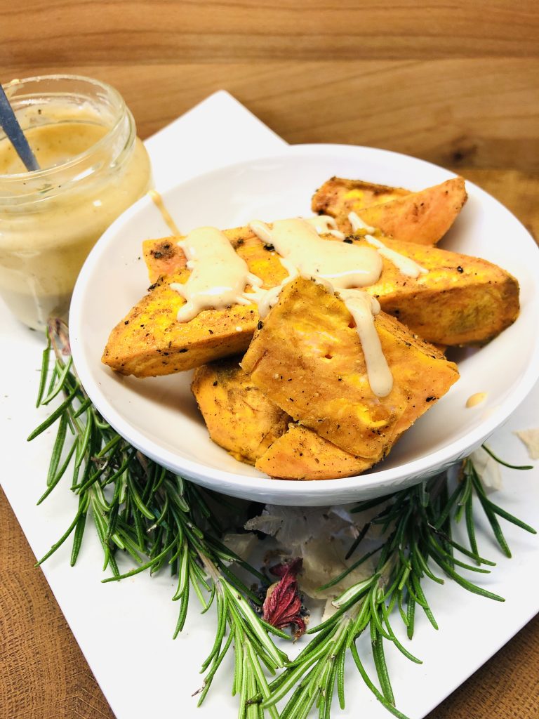 Das Rezept für die gerösteten SüßkartoffelN mit Tahini Dip
