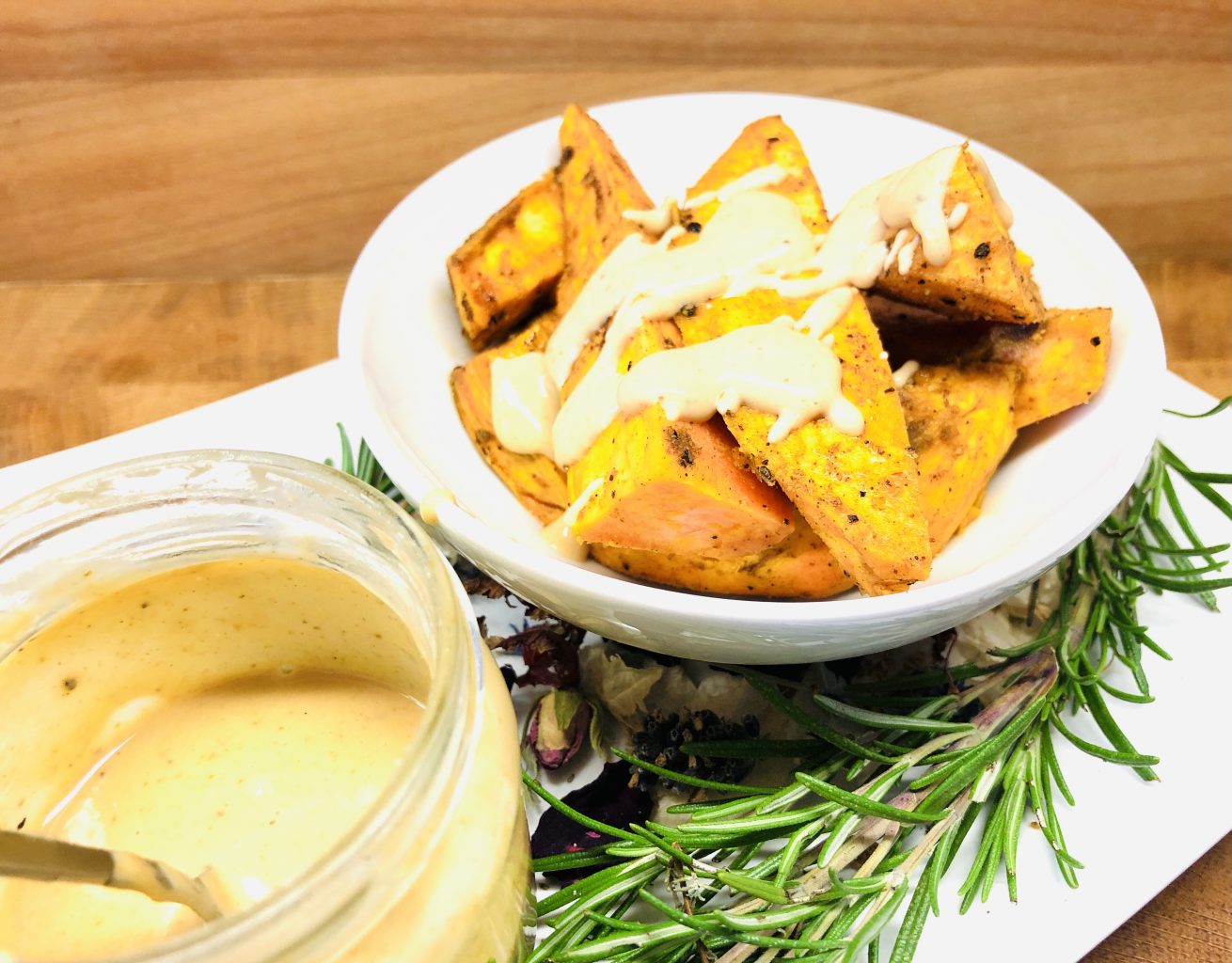 Die cremigen Sauce aus Tahini, Zitronensaft, Ahornsirup und feinen Gewürzen aus Koriander, Cumin, Kardamom und Cayenne Pfeffer gibt den gerösteten Süßkartoffeln einen zusätzlichen süß-würzigen Kick.