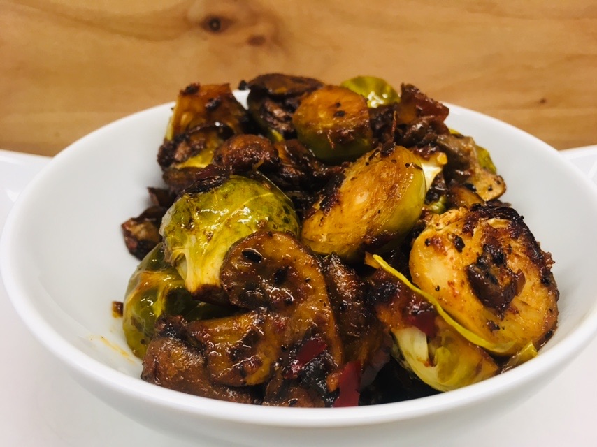 Das Rezept für den gerösteten Rosenkohl mit koranischer BBQ Sauce und knusprigen Champignons