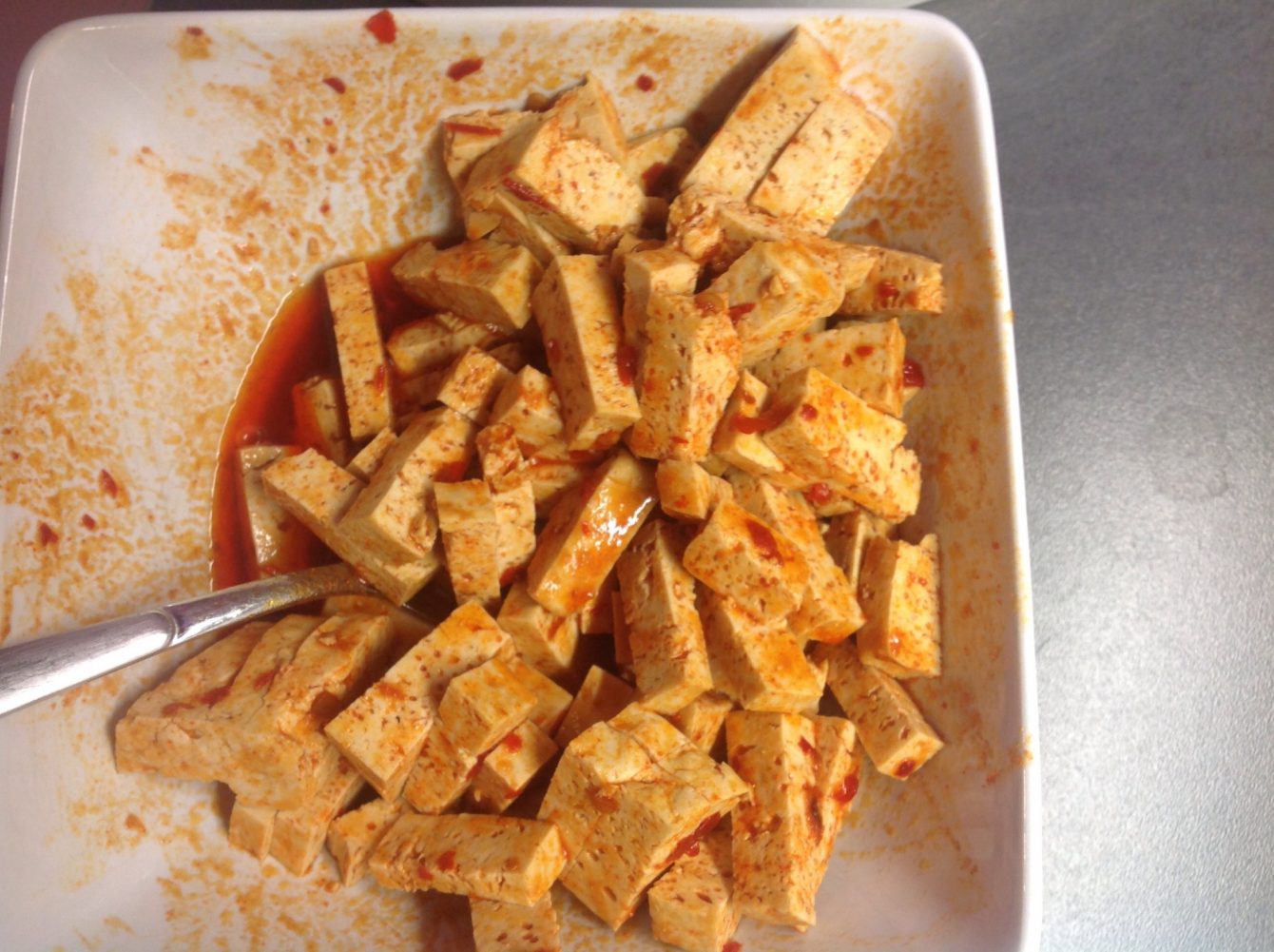 Zuerst die Marinade herstellen, um den Tofu zu marinieren. Dazu Sambal Olek mit Sesamöl, Sojasoße, Reisessig und Reissirup verrühren. Tofu in kleine Würfel schneiden, mit der Marinade vermischen und zum Marinieren zur Seite stellen.