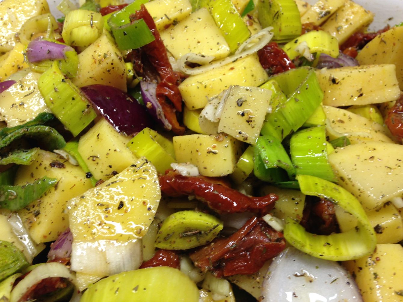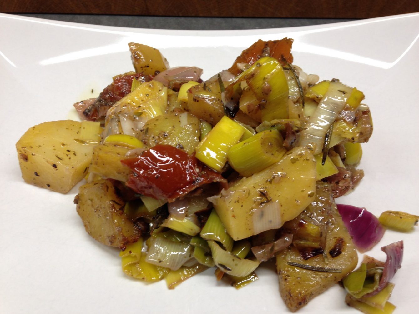 Geschmorte Lauch Kartoffeln mit getrockneten Tomaten, Kräutern und Safranhonig
