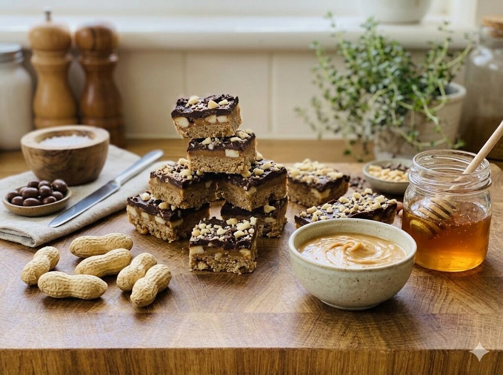 Diese Erdnuss-Honig-Karamell-Riegel sind weich, nussig, cremig und von einer glänzenden Schicht dunkler Schokolade überzogen. Sie bestehen aus nur wenigen Vorratszutaten und sind in wenigen Minuten vorbereitet — ganz ohne Backen, ohne raffinierten Zucker und ohne hochverarbeitete Zutaten.