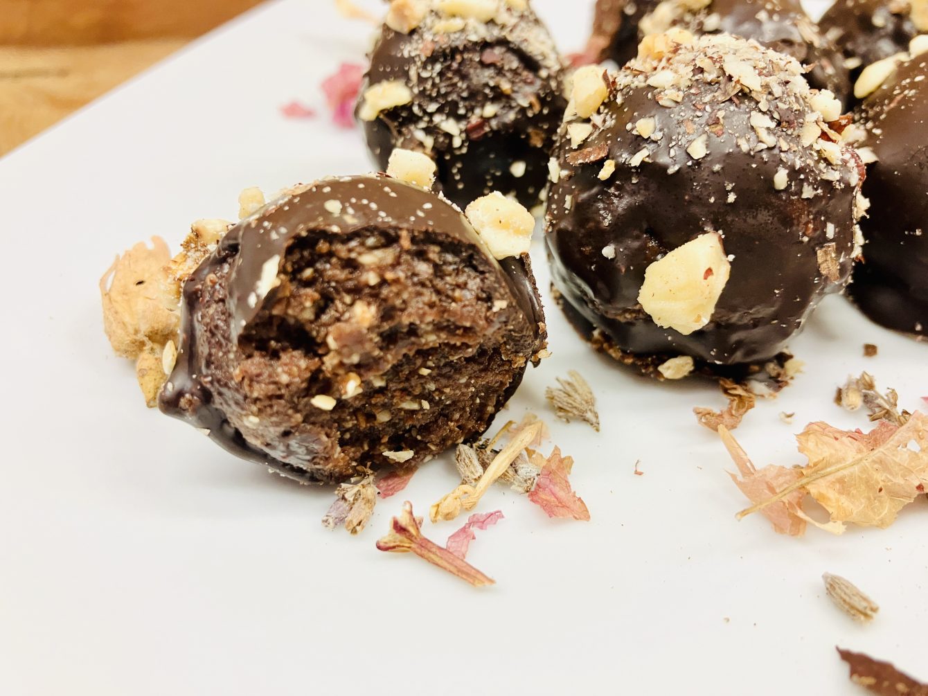Dieses Rezept basiert auf meinen Haselnuss Schokoriegel, hier leicht abgeändert als Schokotrüffel.