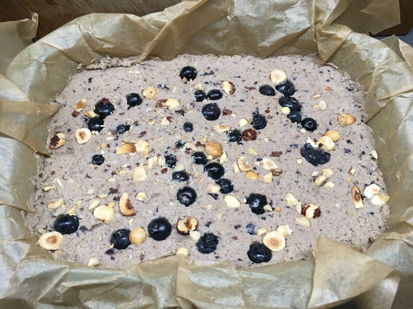 - Den Teig in eine mit Backpapier ausgelegten Backform geben und glatt streichen. Die restlichen Heidelbeeren und Nüsse darüber streuen und in den Teig eindrücken.