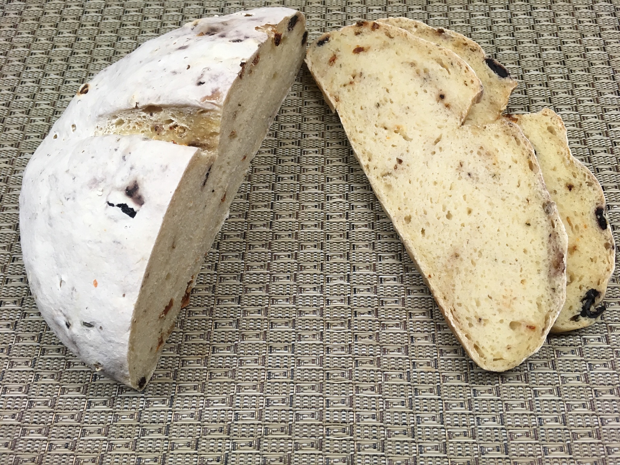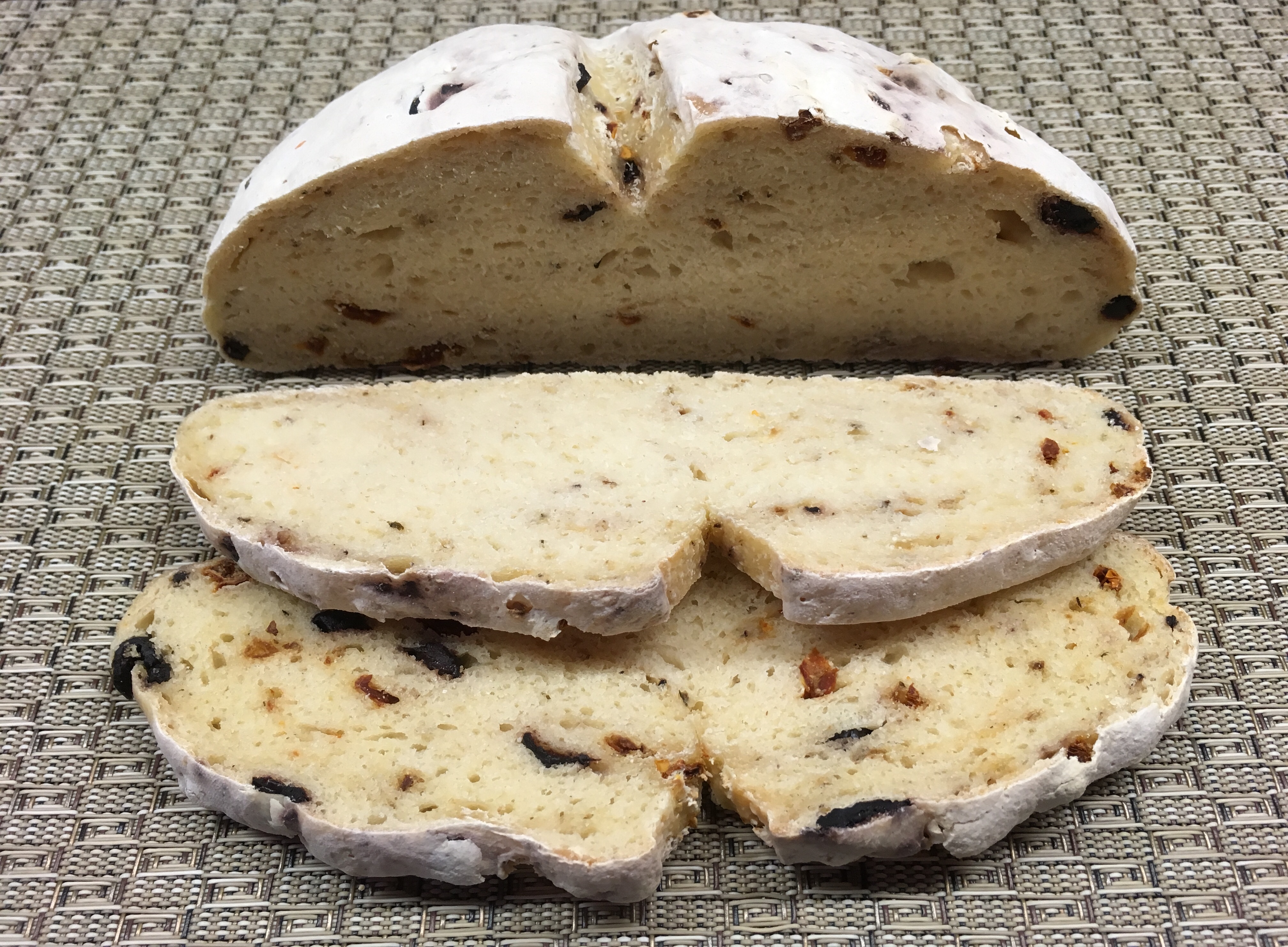 Nach dem glutenfreien Fladenbrot haben wir jetzt mal ein glutenfreies Chiabatta mit Oliven und getrockneten Tomaten ausprobiert.