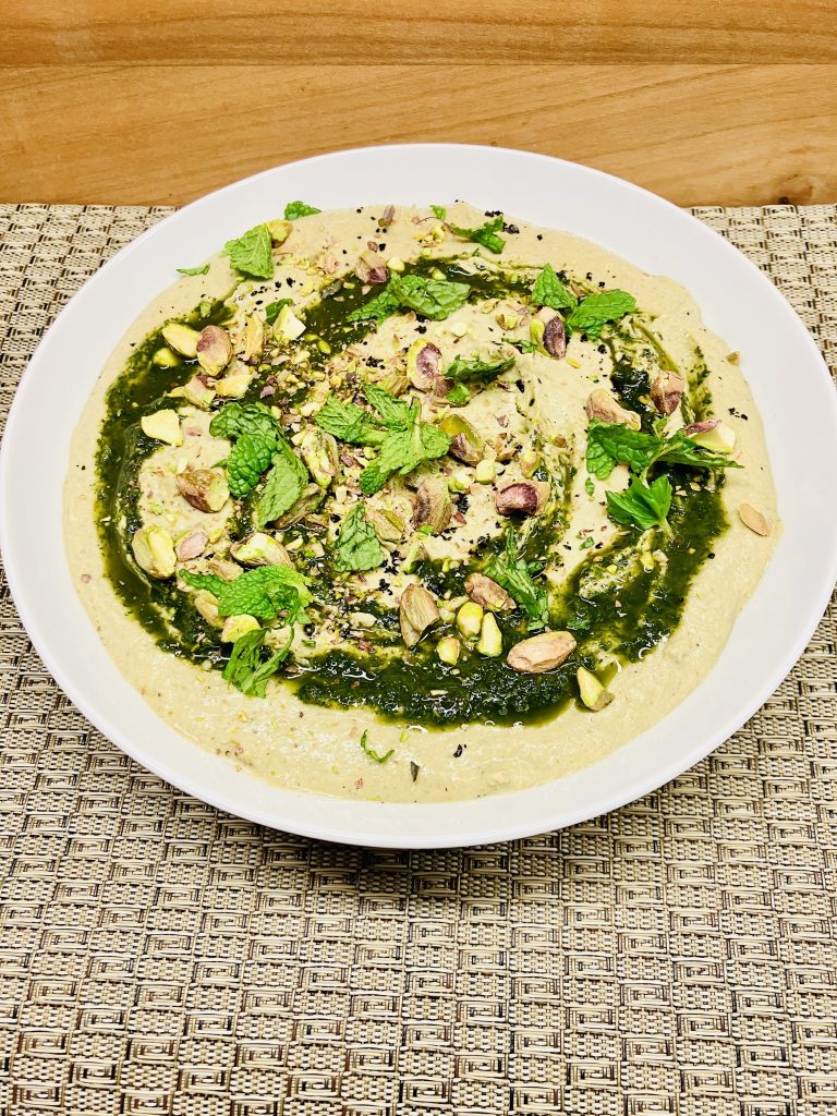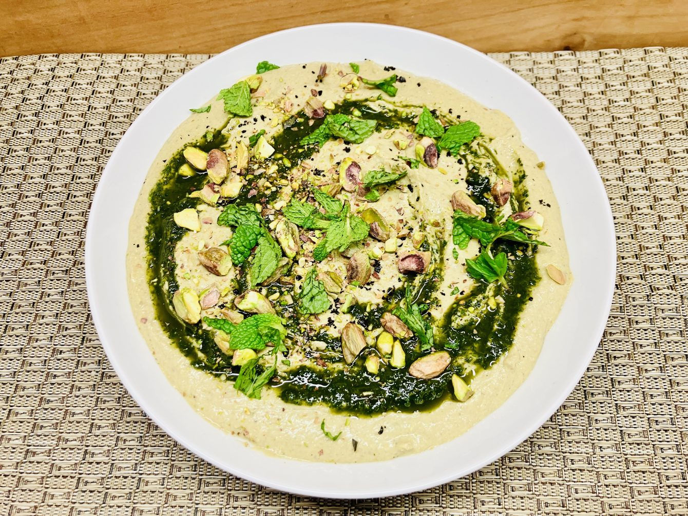 in diesem Hummus kommen Mungobohnen, Tahin und Pistazienmus, Cumin, Koriander, Knoblauch, Olivenöl und Zitronensaft zum Einsatz.