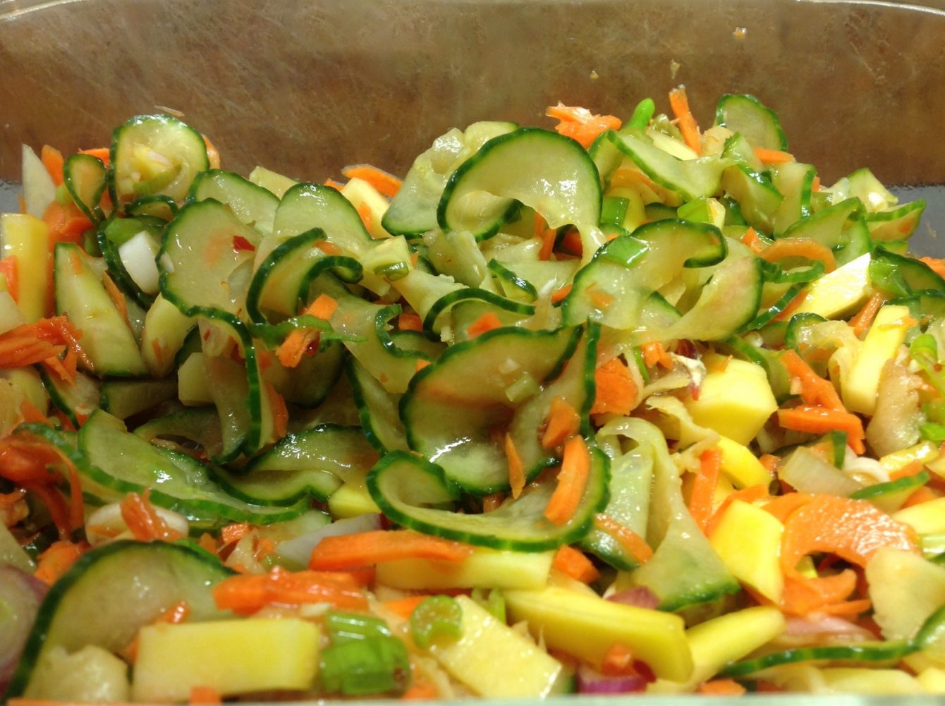 Die Gurke mit einem Spiralschneider schneiden. Die Möhre und die Mango mit dem Julienne Schneider in feine Streifen schneiden. Frühlingszwiebeln fein hacken. Für den Ingwer habe ich Gari genommen, den ich noch im Kühlschrank hatte. Gurken, Mango und Karrotten in eine Schüssel geben. Ingwer oder Gari dazugeben und vermischen.