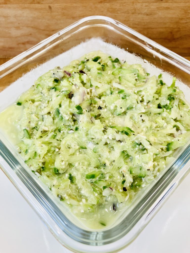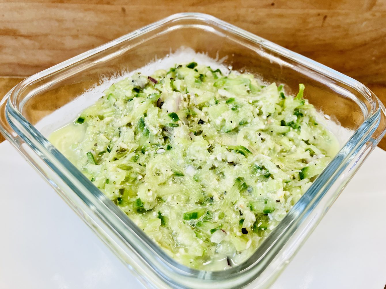 - Schneide die Gurke in dünne Scheiben oder Raspel und den Sellerie ebenfalls. Entferne das Kerngehäuse vom Apfel und schneide ihn in kleine Würfel. Die Frühlingszwiebeln in feine Scheiben schneiden oder hacken, Frische Kräuter ebenfalls fein Hacken. Gib alles in eine große Schüssel und vermische es gut.