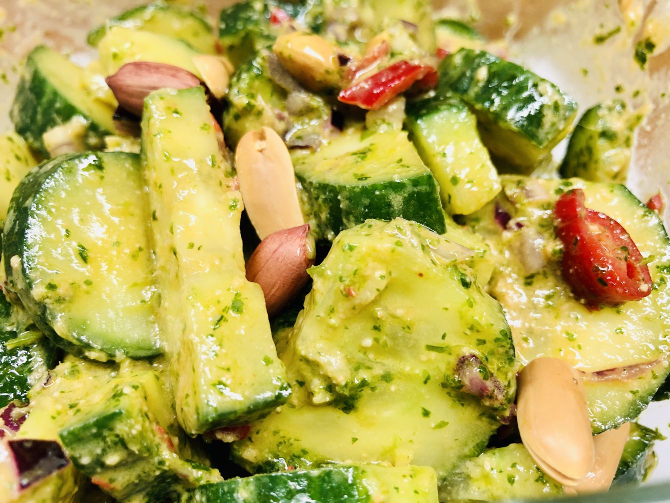 Dieser würzige Gurkensalat mit cremigem Erdnuss Dressing ist inspiriert von der asiatischen Küche.