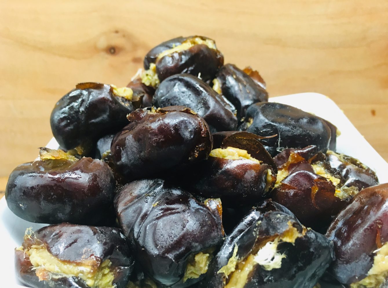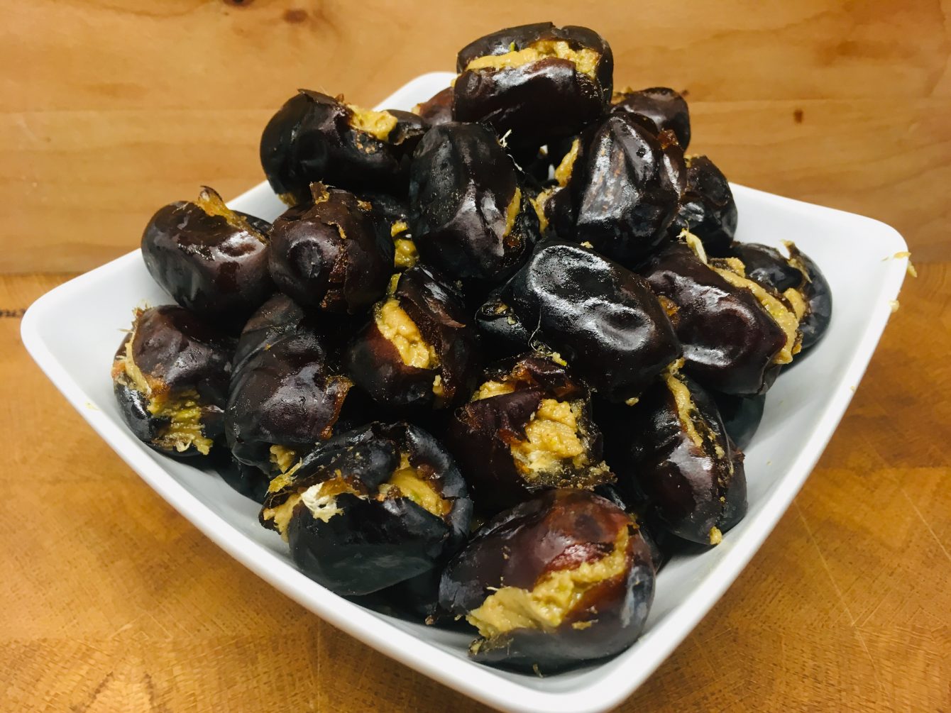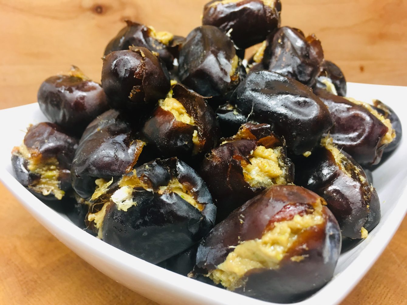 - Datteln an einer Seite aufschneiden und mit einem halbe TL der Halva Masse Füllen.