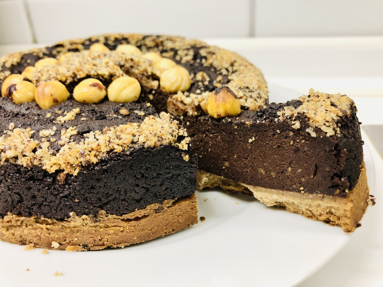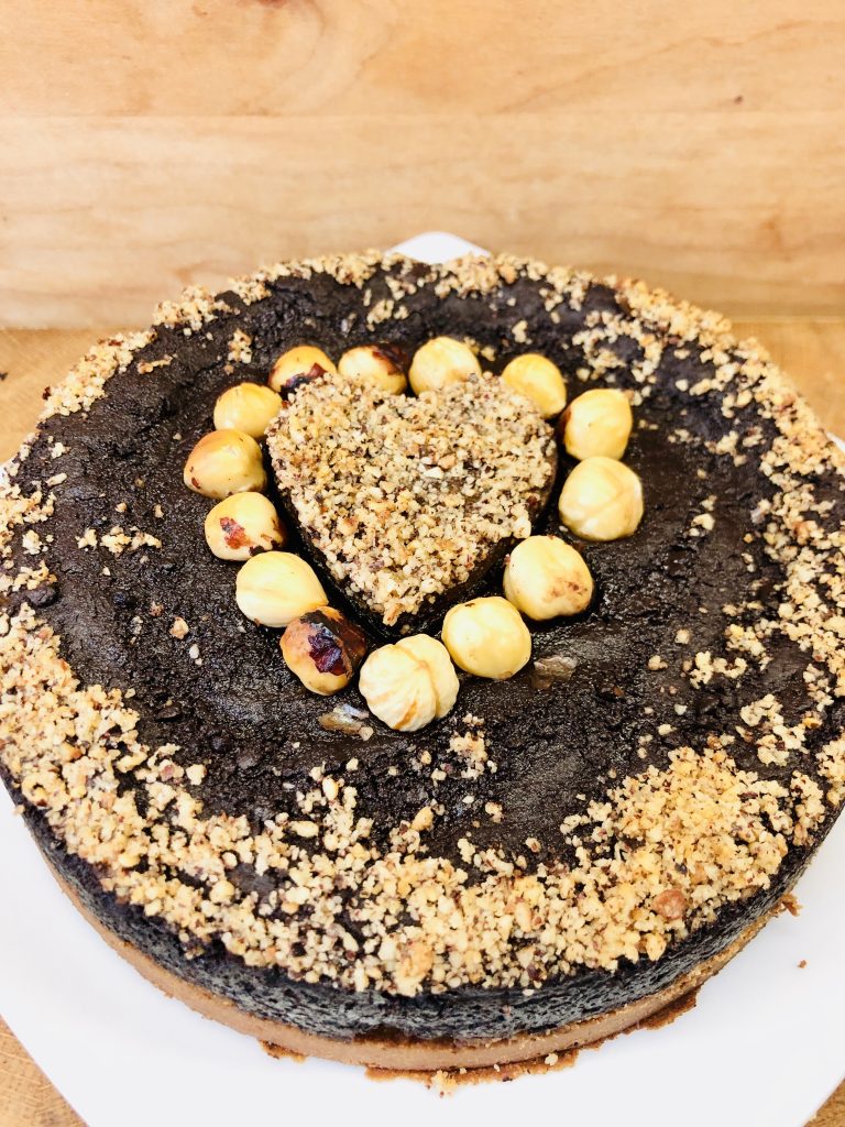 Dieser Haselnuss Schoko Kuchen hat einen samtige Kastanien Shortbread Boden und einem Herz aus Haselnuss Marzipan.