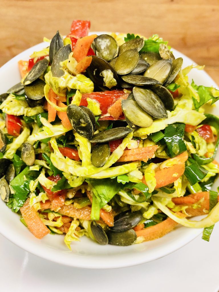Das Rezept für den Rosenkohl Salat mit Karotten, Paprika und Orangen-Kürbis Dressing