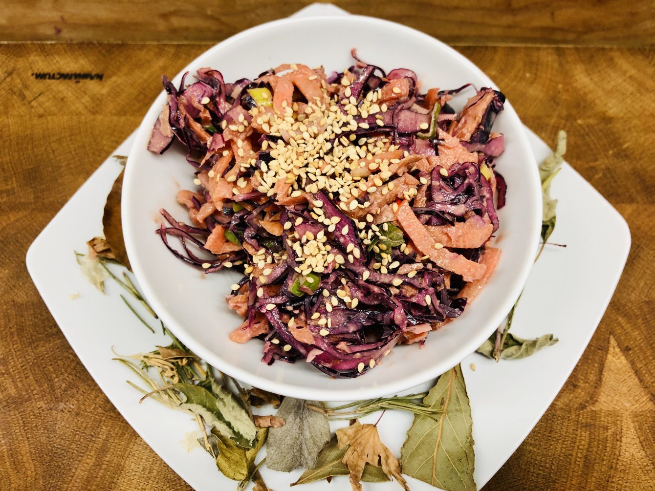 - Rotkraut Salat mit Soja-Sauce und gewürzten Kürbiskernen