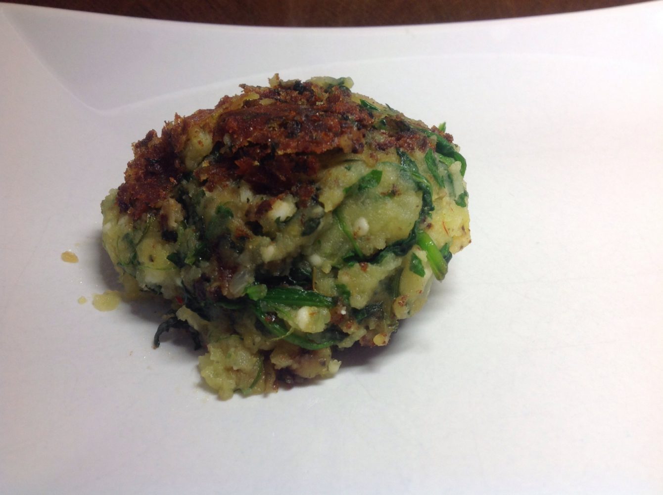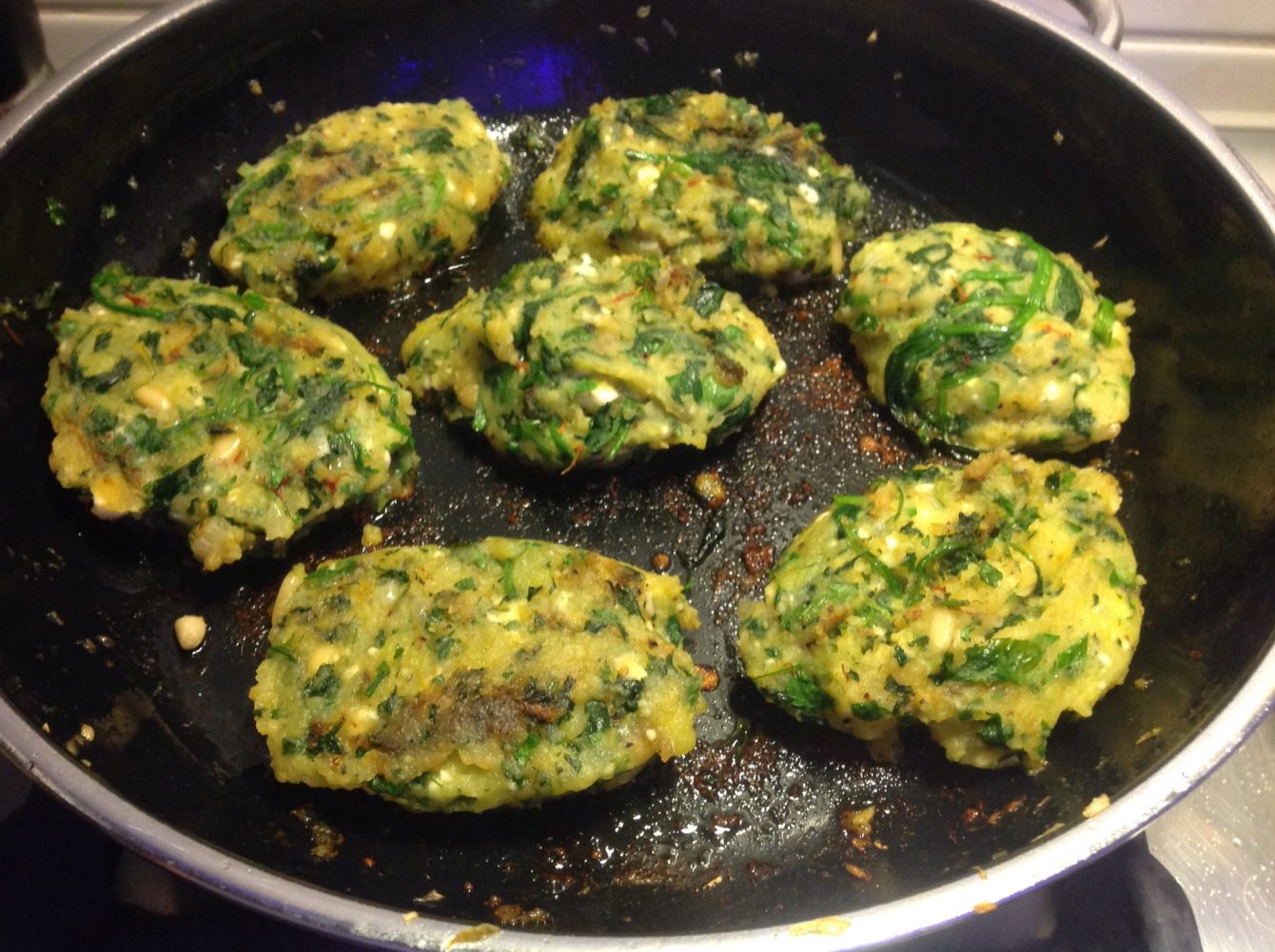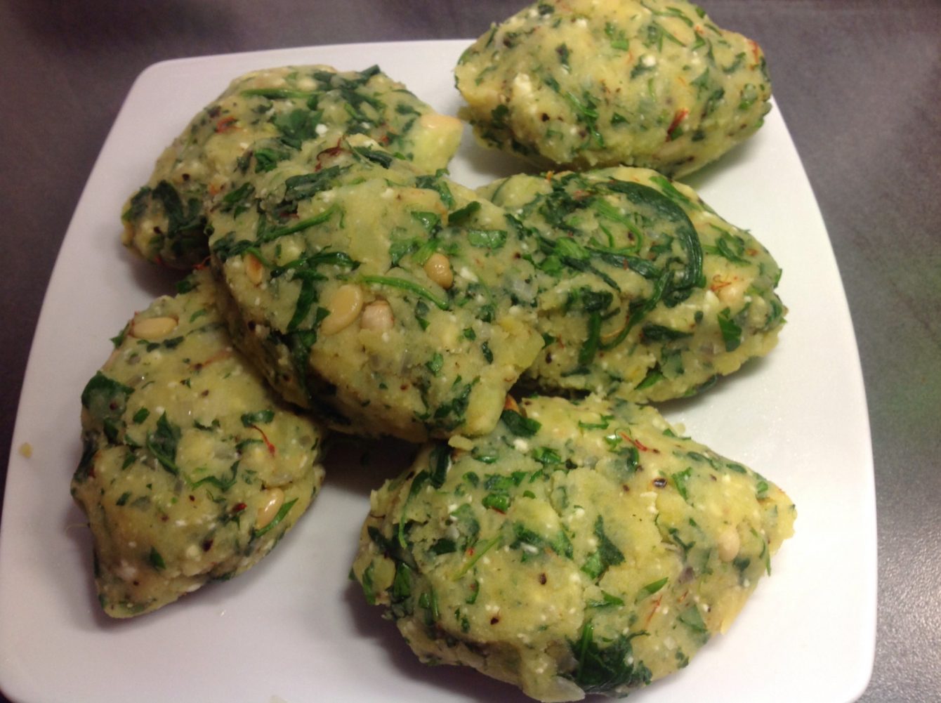 Kartoffeln Pellen und mit einem Kartoffelstampfer zerstampfen, Feta, Pinienkerne und Spinat dazugeben und gut vermischen. Mit Cumin, Safran, Chiliflocken, Muskat, Pfeffer und Salz würzen und abschmecken. zum Schluss die Petersilie untermischen.