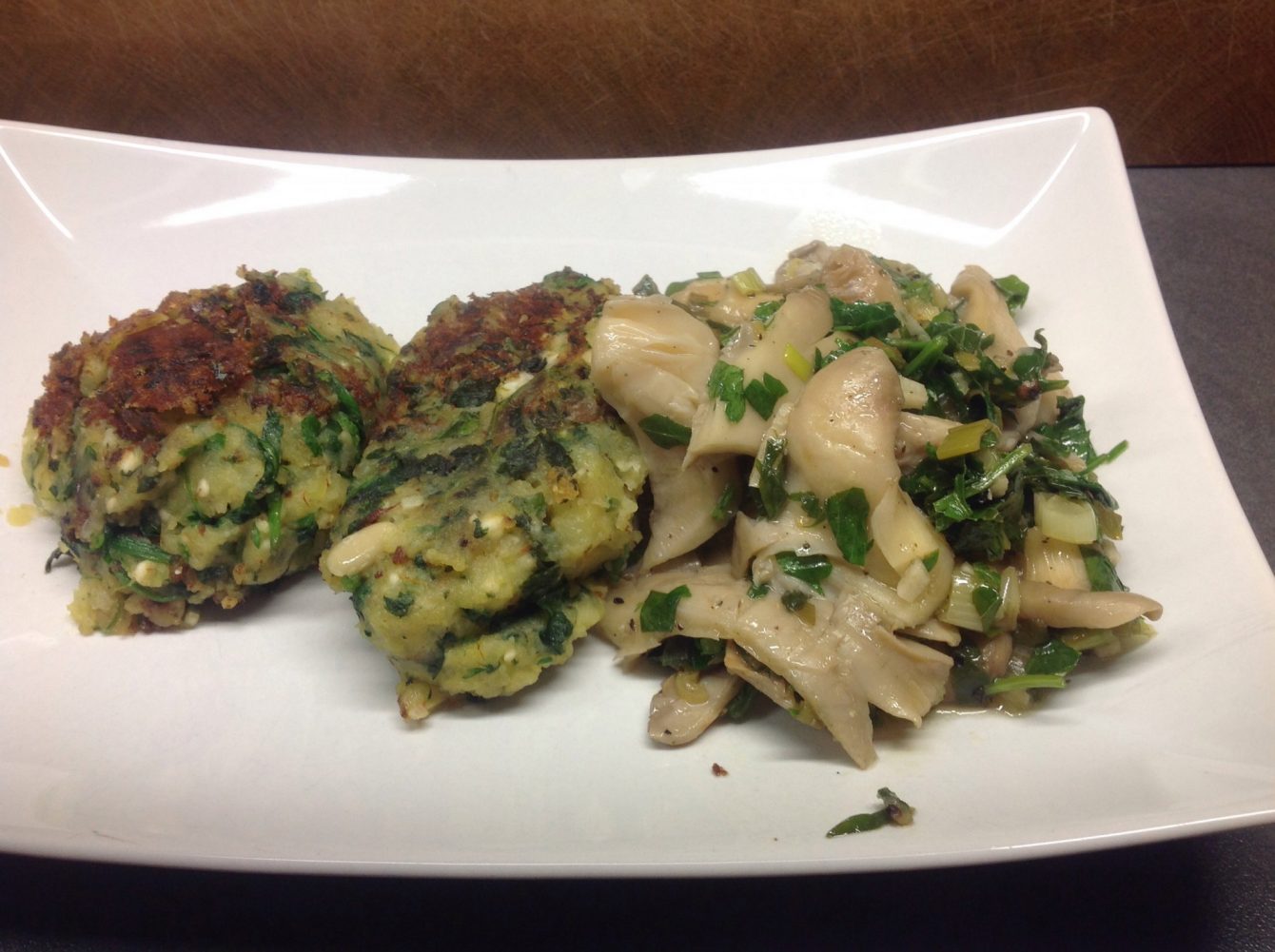 Den Kartoffelteig zu 10 Puffern formen und in Olivenöl braten.