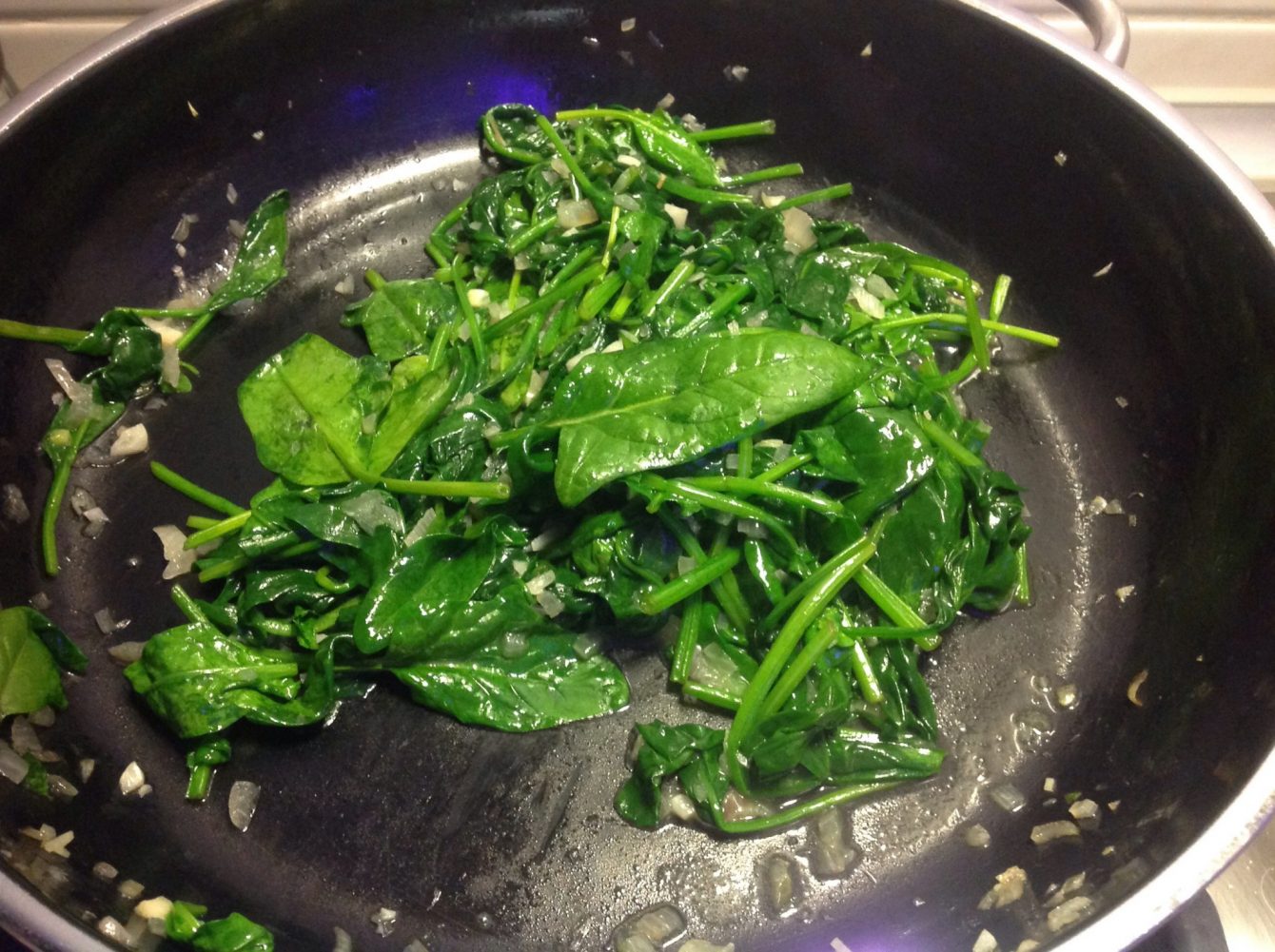 In einer Pfanne Öl erhitzen und Knoblauch und Zwiebeln glasig dünsten. Spinat dazugeben und 2-3 Minuten dünsten.