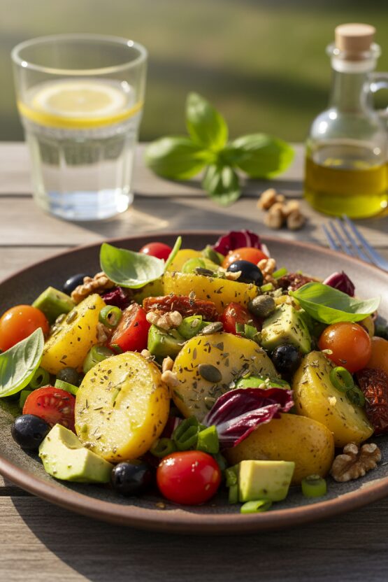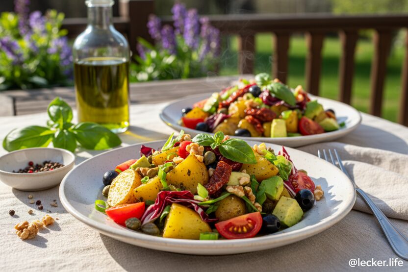 Stell dir vor, du sitzt an einem milden Frühlingstag auf deiner sonnigen Terrasse, die Luft riecht nach frischem Basilikum und leicht gerösteten Walnüssen. Der Duft von Kürbiskernöl zieht wie eine angenehme, nussige Brise durch die Küche, während du den warmen Kartoffelsalat mit mediterranem Gemüse und cremiger Avocado anrichtest. Genau dieses Wohlgefühl bringt dieses Rezept auf den Teller – eine wunderbare Kombination aus erdigen Kartoffeln, knackigen Radicchio-Blättern und einer frischen Kürbiskernöl-Vinaigrette, die einfach Lust auf mehr macht.