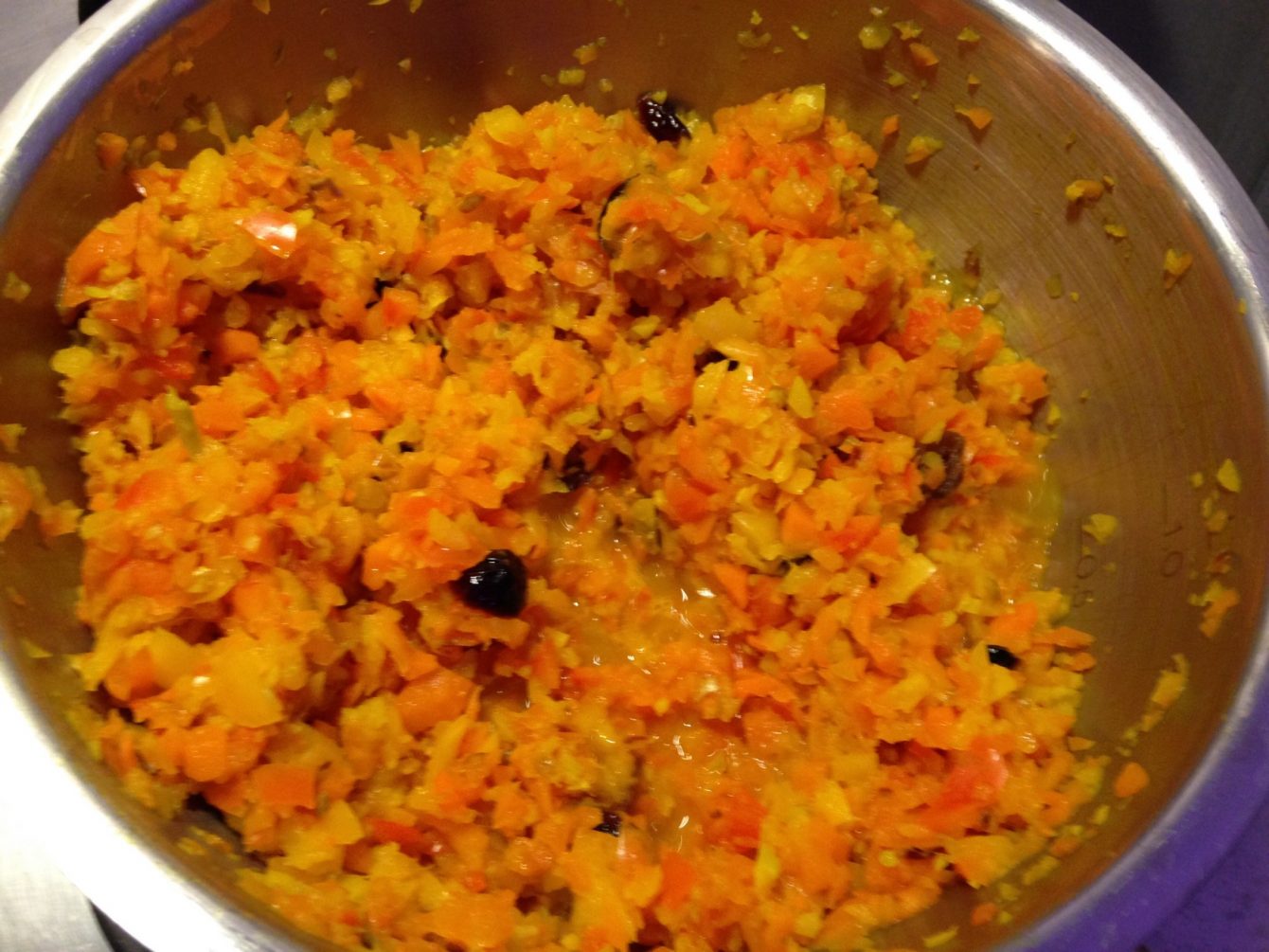 In einer Pfanne Öl erhitzen und Zwiebeln und Knoblauch glasig dünsten. Möhren, Paprika und Cranberries hinzufügen und für ca. 3 Minuten dünsten.