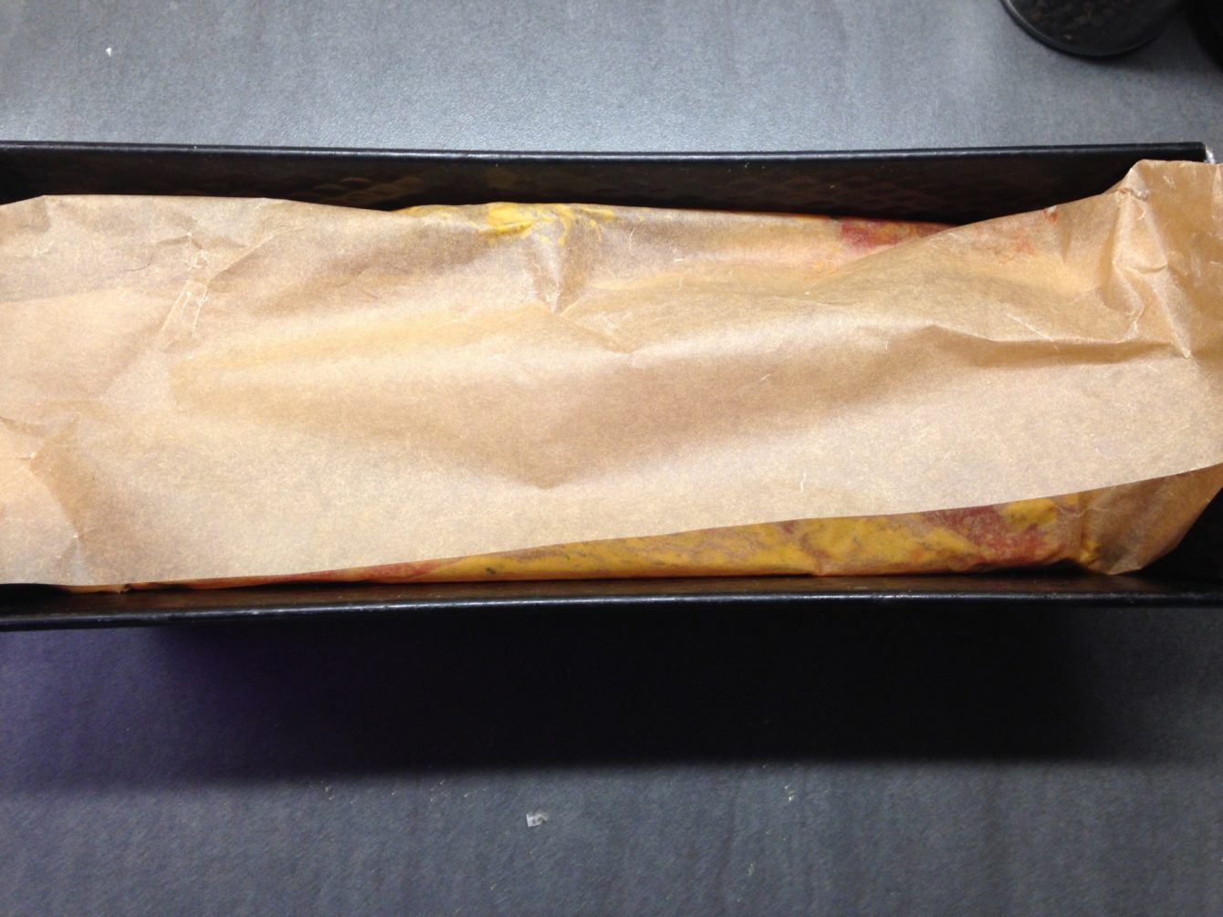 Mischung in eine eingeölte oder mit Packpapier ausgeschlagene Brotform geben.