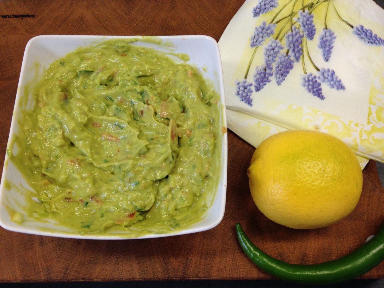 Dieser klassische Guacamole Dip besteht aus Avocado, Tomaten, Paprika, Ingwerr, Chili, Knoblauch, Zitrone und Koriander.