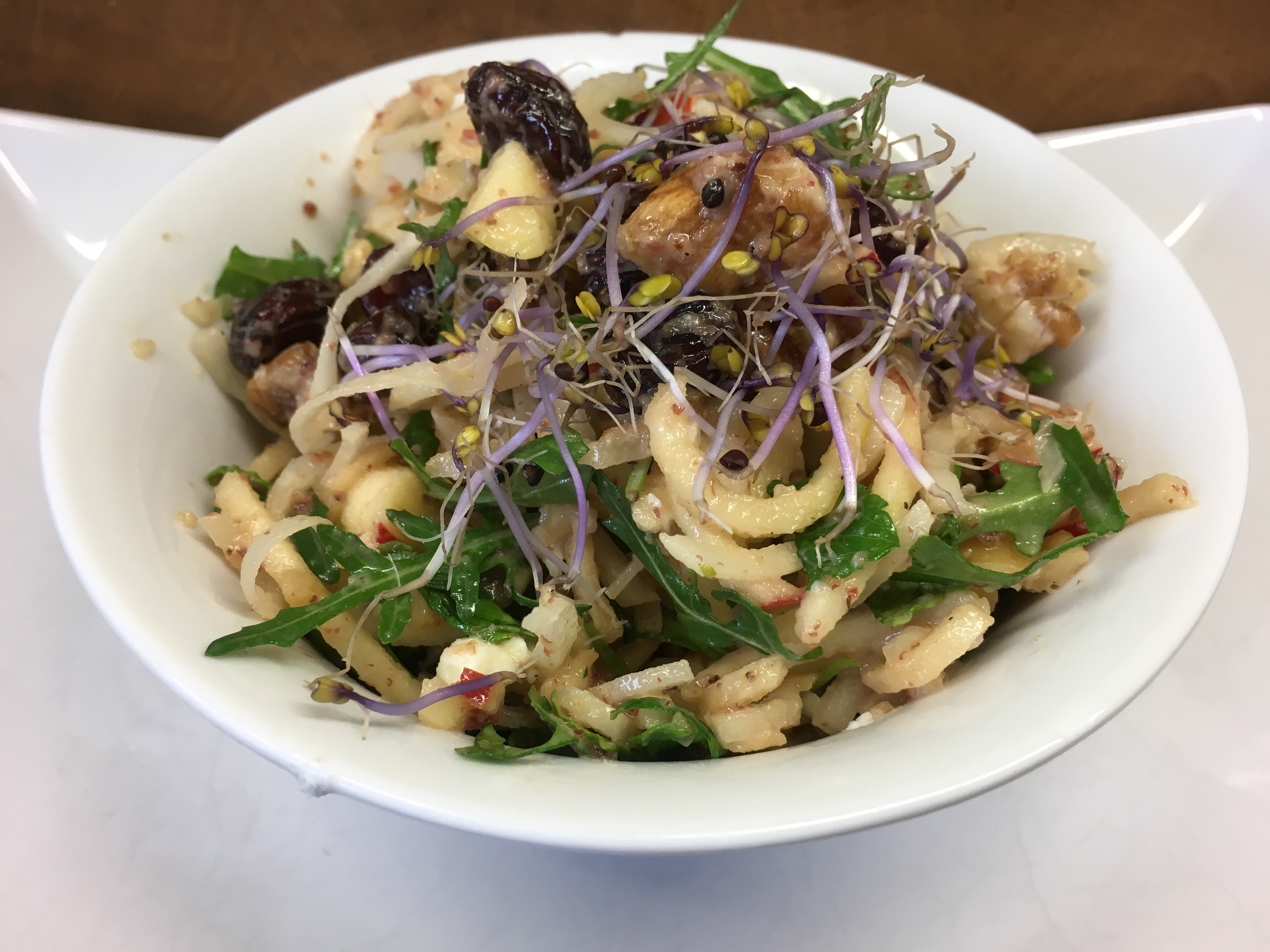 Das Rezept für den Kohlrabi Apfel Salat mit Walnüssen, Cranberries und Ziegenkäse mit Cranberry Dattel Vinaigrette