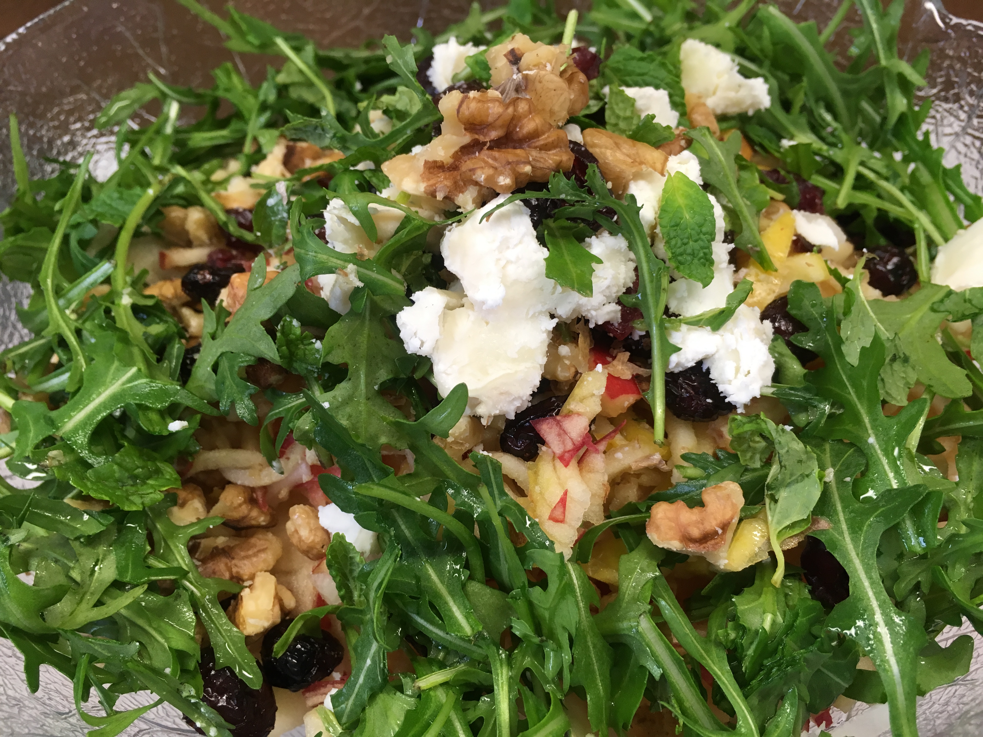 Als erstes fiel mir dieses Salat Rezept ein mir Kohlrabi und Apfel, gemischt mit Cranberries, Walnüssen, Rucola und Ziegenkäse, serviert mit einem Dattel Cranberry Senf Dressing und frischer Minze.