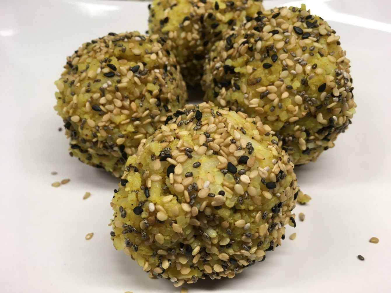Diese würzigen Kokosnuss Reis Bällchen überraschen mit einer fruchtigen Bananen Masala Füllung, inspiriert von Berliner Ballen und italienischen Aranchini.