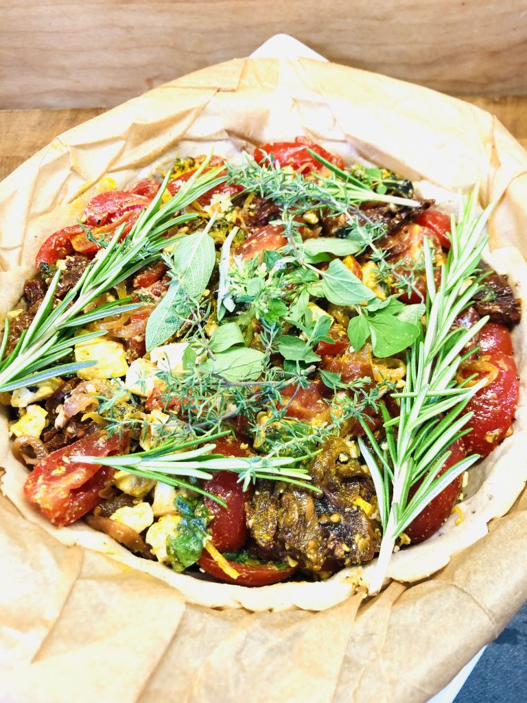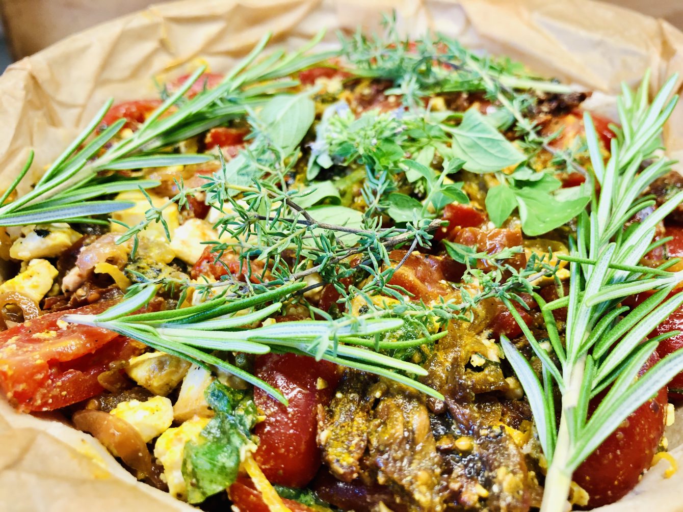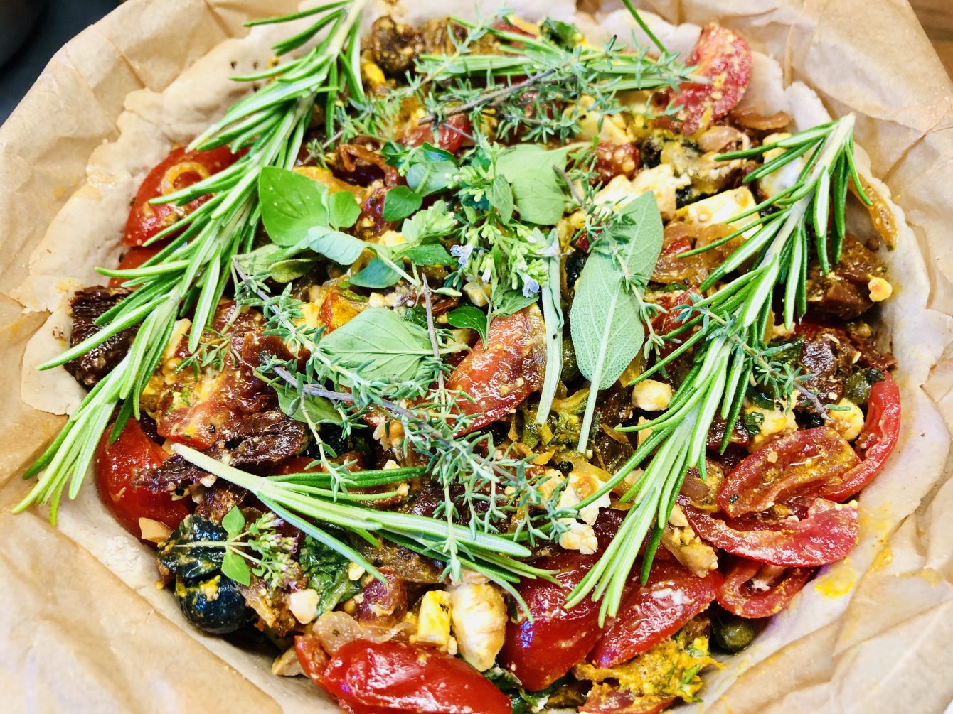 Die Füllung besteht aus frischen und getrockneten Tomaten, Zwiebeln, Knoblauch, Kapern und Oliven und optional (veganem) Feta. Aromatisiert mit einem Potpourri aus Gewürzen und frischen Kräutern, unter anderem die Nepita Minze. Ihr könnt aber auch andere Minze verwenden.