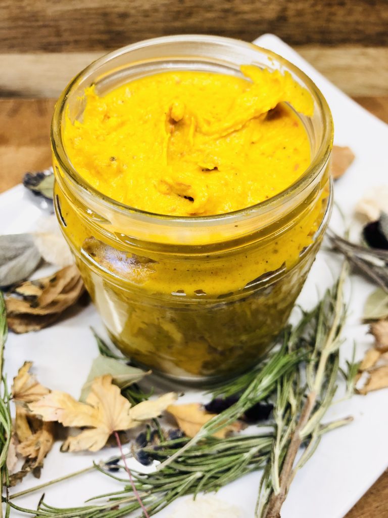 Dieser Kürbis Dip mit Tahini besteht aus geröstetem Kürbis, Sesammus, Olivenöl, Cumin, Zitronensaft, Salz und weiteren Gewürzen nach Geschmack.