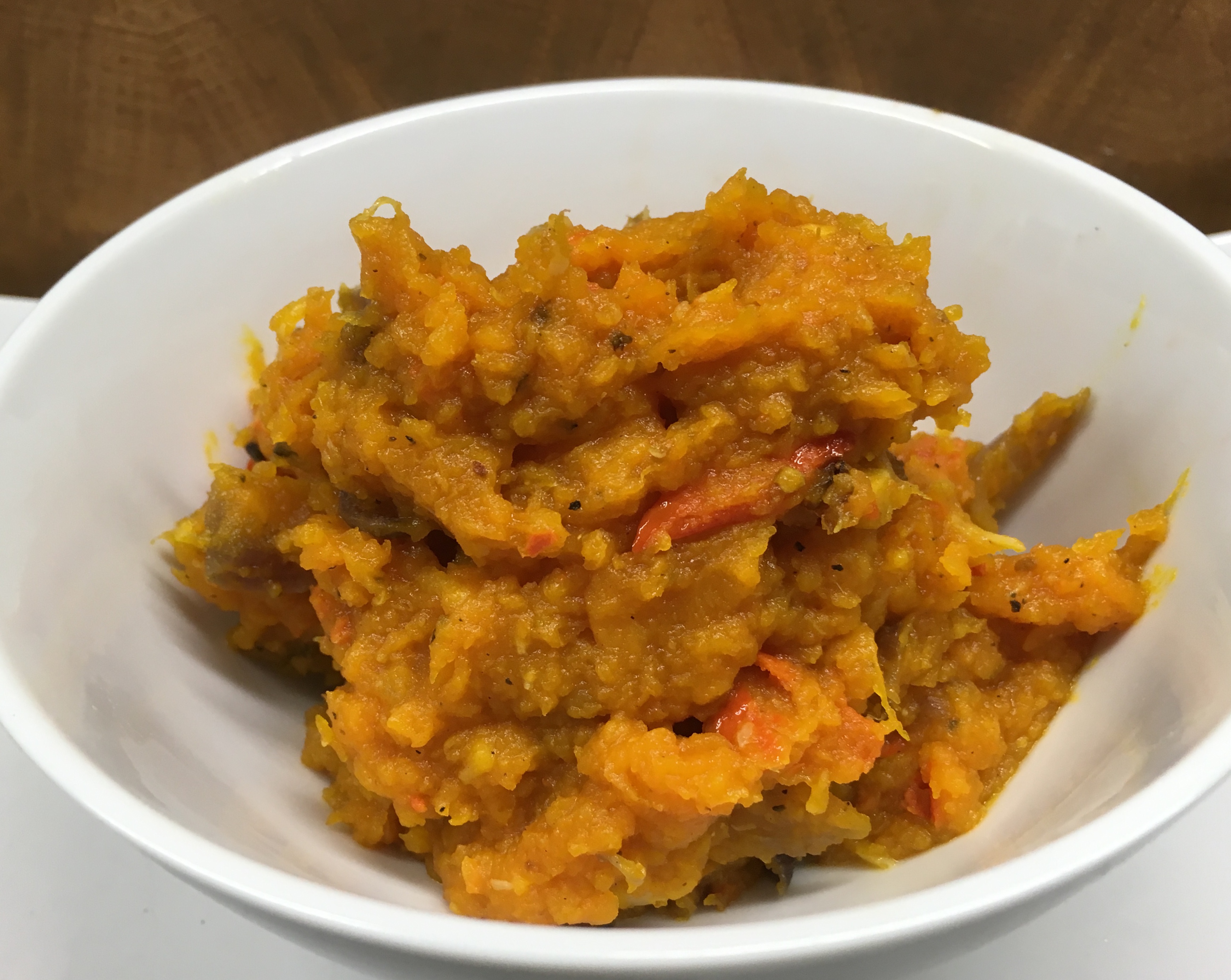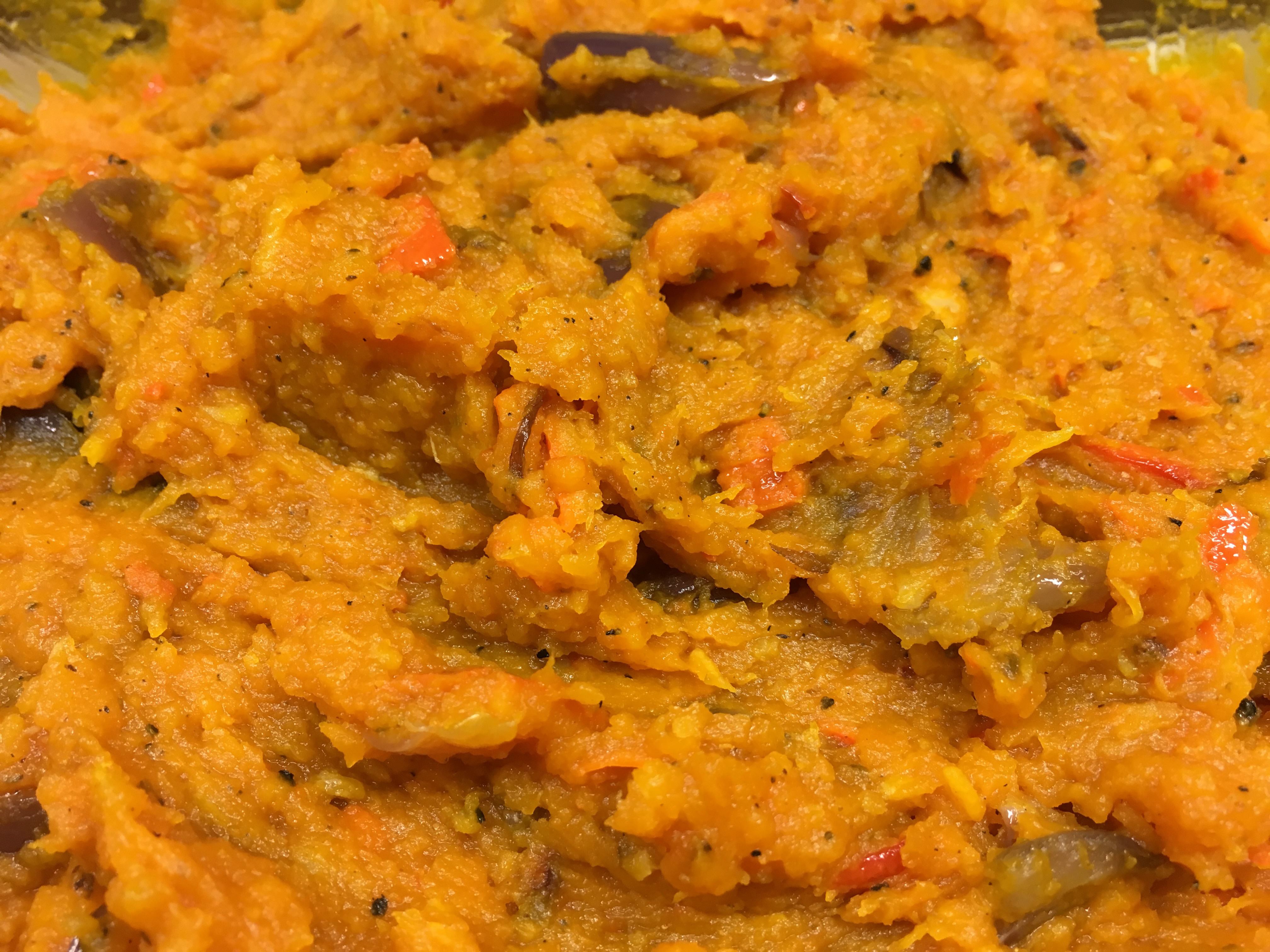 - Wenn der Kürbis gar ist, die Gewürze entfernen, die Kardamomkapseln ausdrücken und das geröstete Gemüse zusammen mit allen übrigen Gewürzen, den Datteln, dem Miso und dem Zitonensaft mit einer Gabel zu einer groben, aber noch stückigen Paste verarbeiten.
