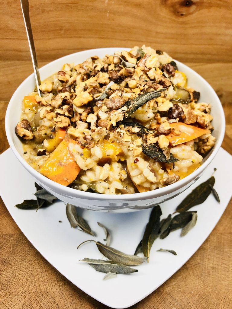 Das Kürbis Risotto mit Champignons, Walnüssen und Salbei ist ein wunderbares Gericht für den Herbst.
