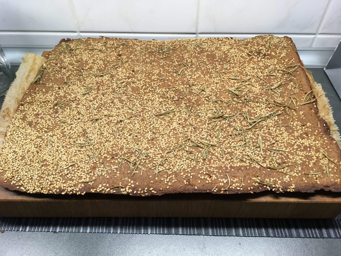 - Den Teig auf der Backfolie auslegen und ausstreichen und Im Dörrofen ca. 8-9 h bei 40°C trocknen lassen oder im Ofen bei 50 Grad 4-5 Stunden trocknen lassen, dabei die Ofentür leicht geöffnet lassen, damit die Feuchtigkeit entweichen kann. Nach der Hälfte der Zeit vom Backblech nehmen und auf das Gitter legen. Oder, wenn das Brot nicht roh sein muss, auch bei 175 Grad ca. 30-60 Minuten backen, und bei offener Ofentür im Ofen austrocknen lassen, je nachdem, wie feucht oder chrunchig Ihr das Brot haben möchtet. Beim Backen eine zweite Backfolie auf die Masse legen, damit die Kruste nicht zu sehr austrocknet oder verbrennt.