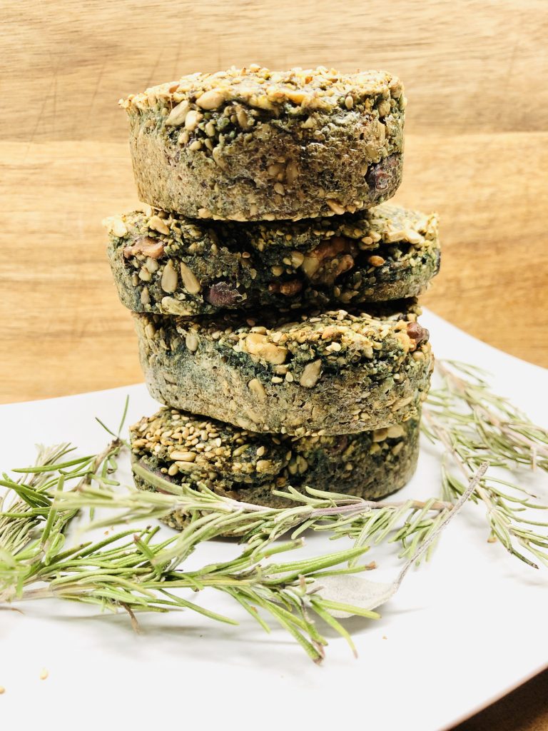 Einfach Nüsse, Samen und Kerne vermischen und mit Wasser, Apfelessig und etwas Natron zu einem klebrigen Teig vermischen, formen und backen. Die Zutaten sind beliebig variierbar.