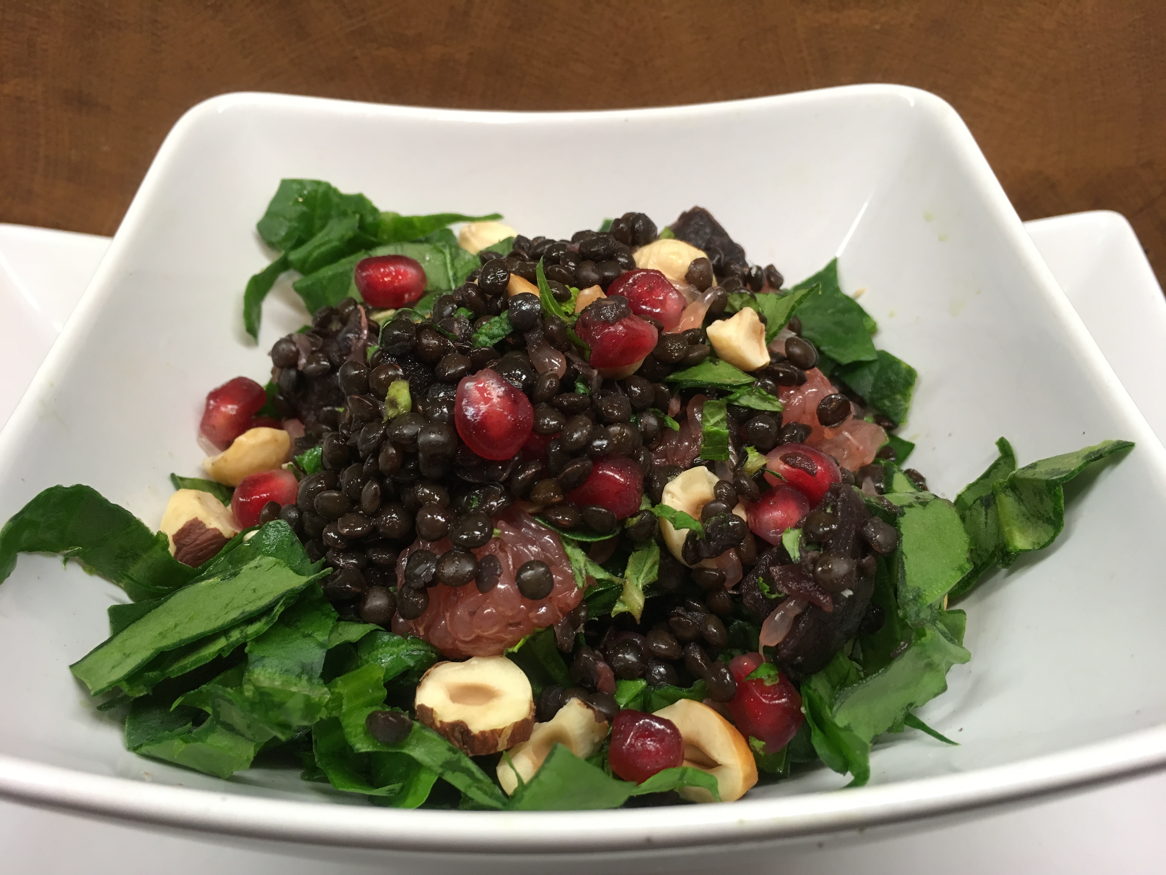 Linsen Salat mit gerösteten Rote Bete, Grapefruit, Spinat, Haselnüssen und Granatapfelkernen aus Beluga Linsen, serviert mit einem leckeren Dattel Ingwer Vinaigrette Dressing und frischer Minze.