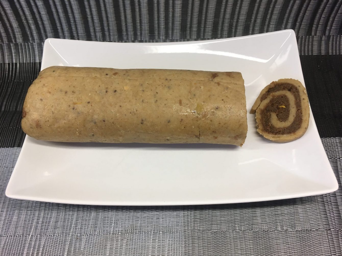 Dieser Mohnkuchen in Form einer Mandel Mohn Kuchen Rolle mit Datteln besteht aus einem Teig aus Datteln und Mandelmehl und einer Füllung aus Mohnpaste und frischen Datteln und Gewürzen.