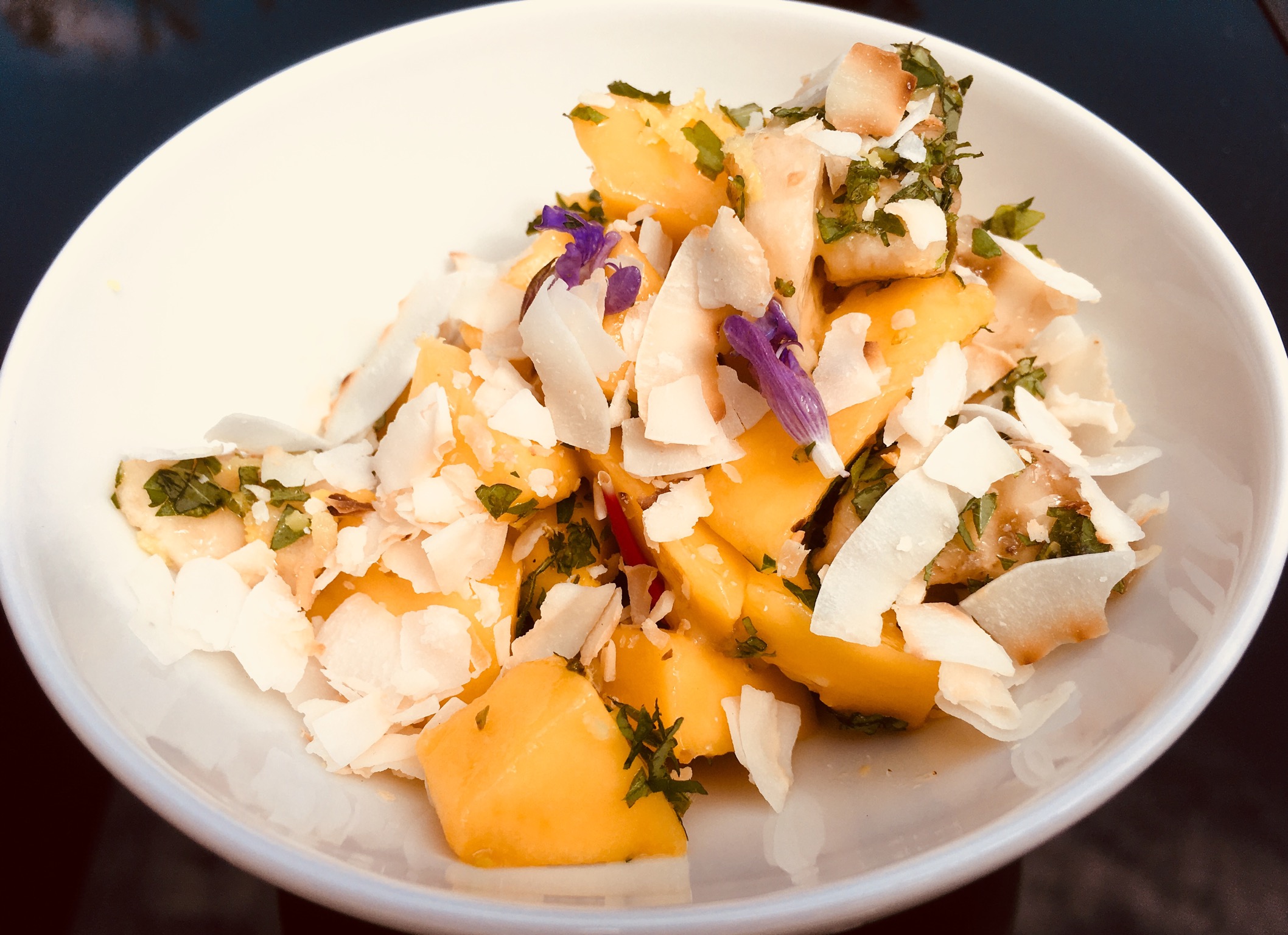 - Mangowürfel und die Banane in einer Salatschüssel vermischen und mit den Süßkräutern, Zitronenzesten und Kokosflocken vermischen.