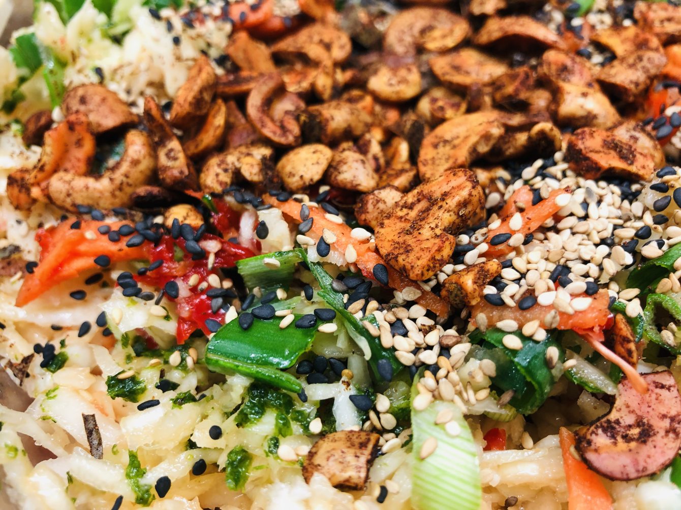 Ich kombiniere diesen Salat mit Gurke, Sesam und meinen Devilled Cashews aus Sri Lanka.
