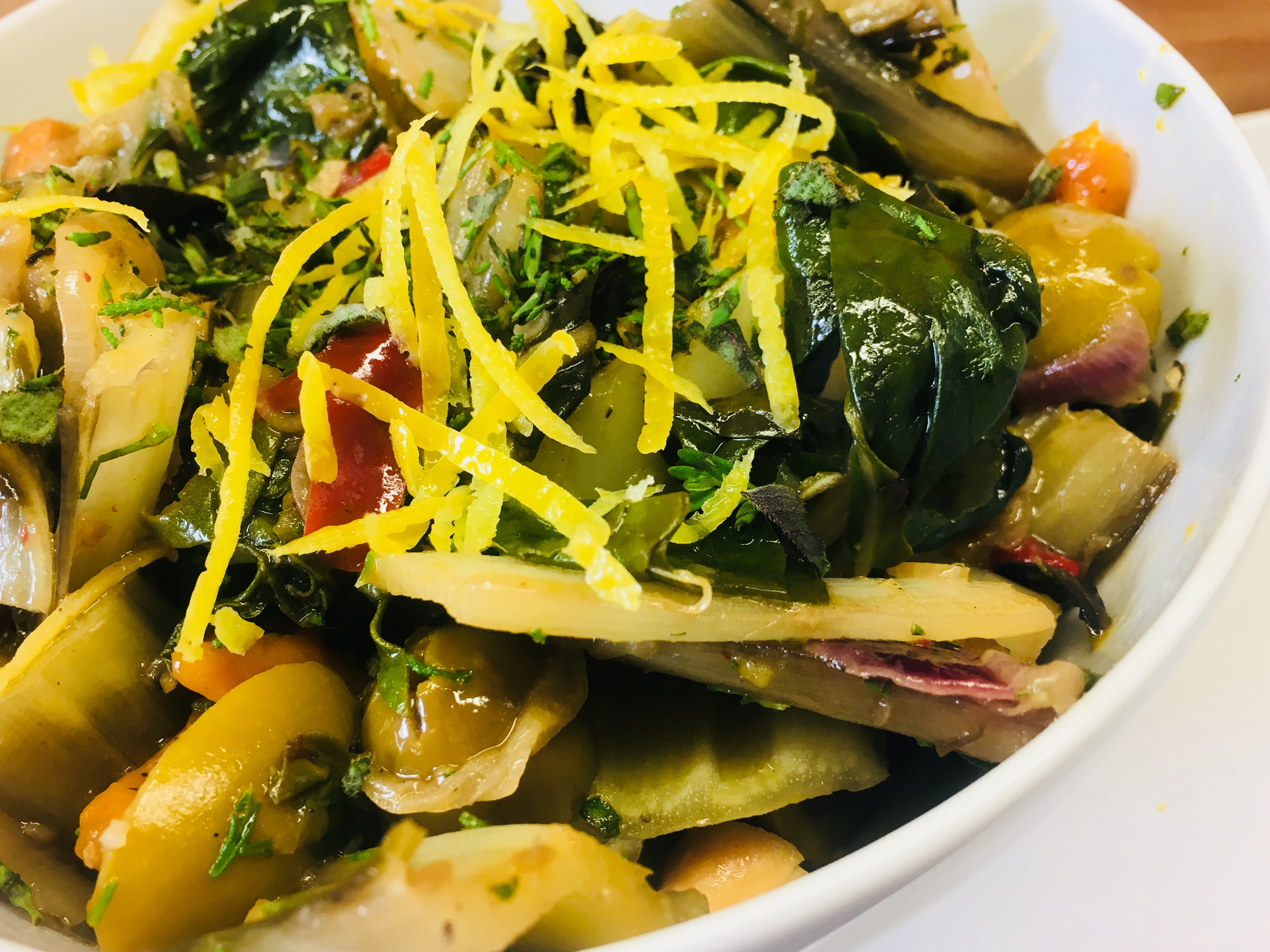 - Das Gemüse mit Zitronensaft, Salz und Pfeffer abschmecken und mit den Pinienkernen, Zitronenzesten und frischen Kräuter garniert servieren.