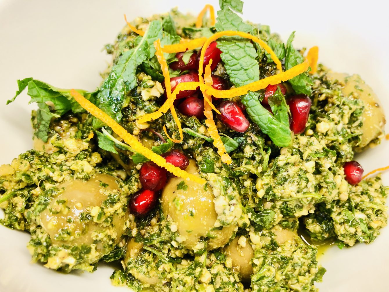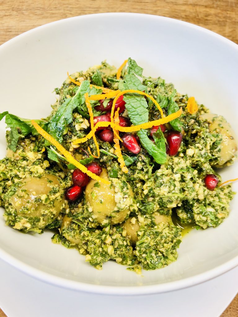 - Olivenöl mit Granatapfelsirup, Granatapfelsaft, Anis, Knoblauch, frischen Kräutern, Walnüssen, Salz und Pfeffer mischen.