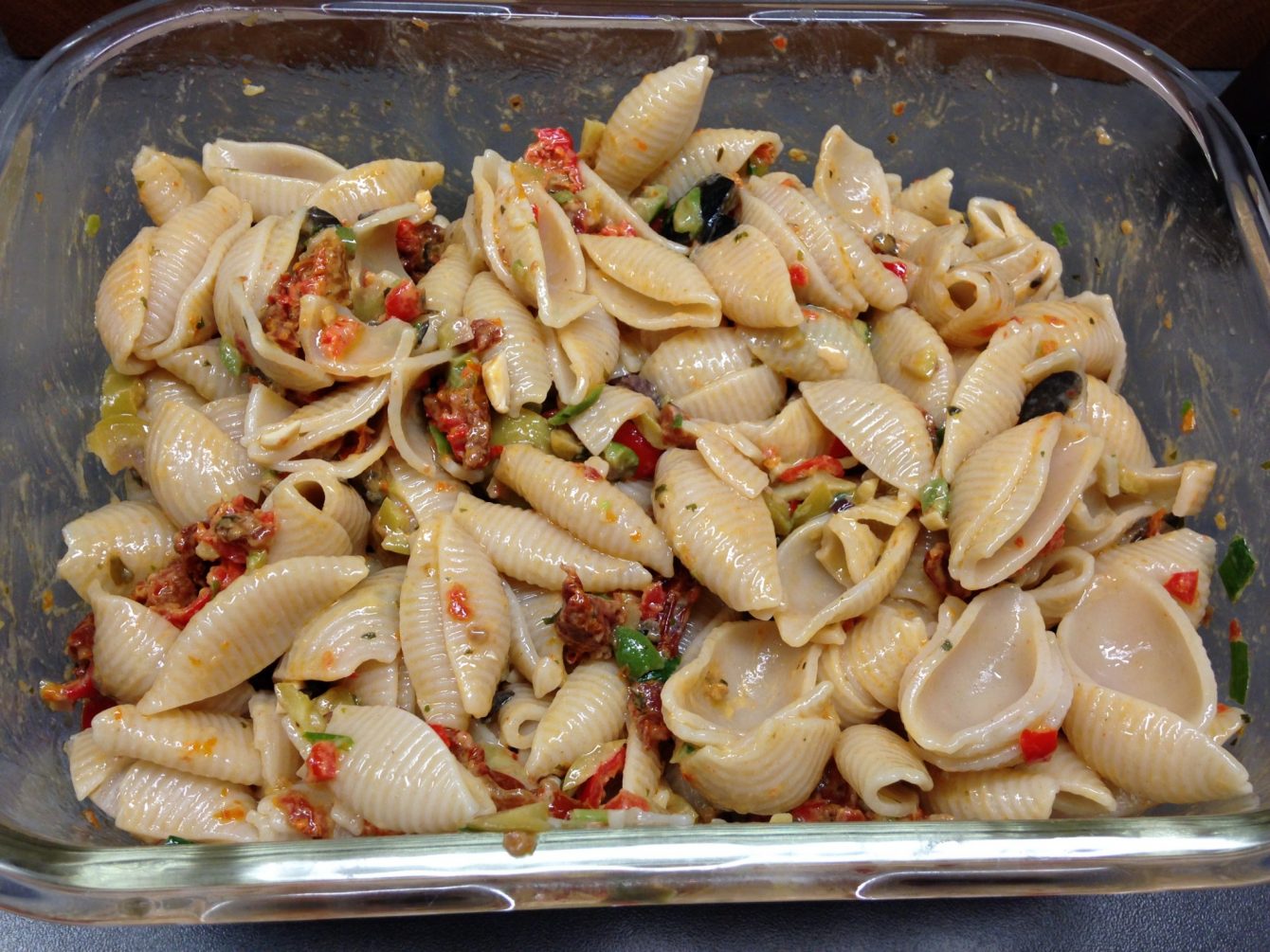 Nudelsalat mit Antipasti Oliven und getrockneten Tomaten