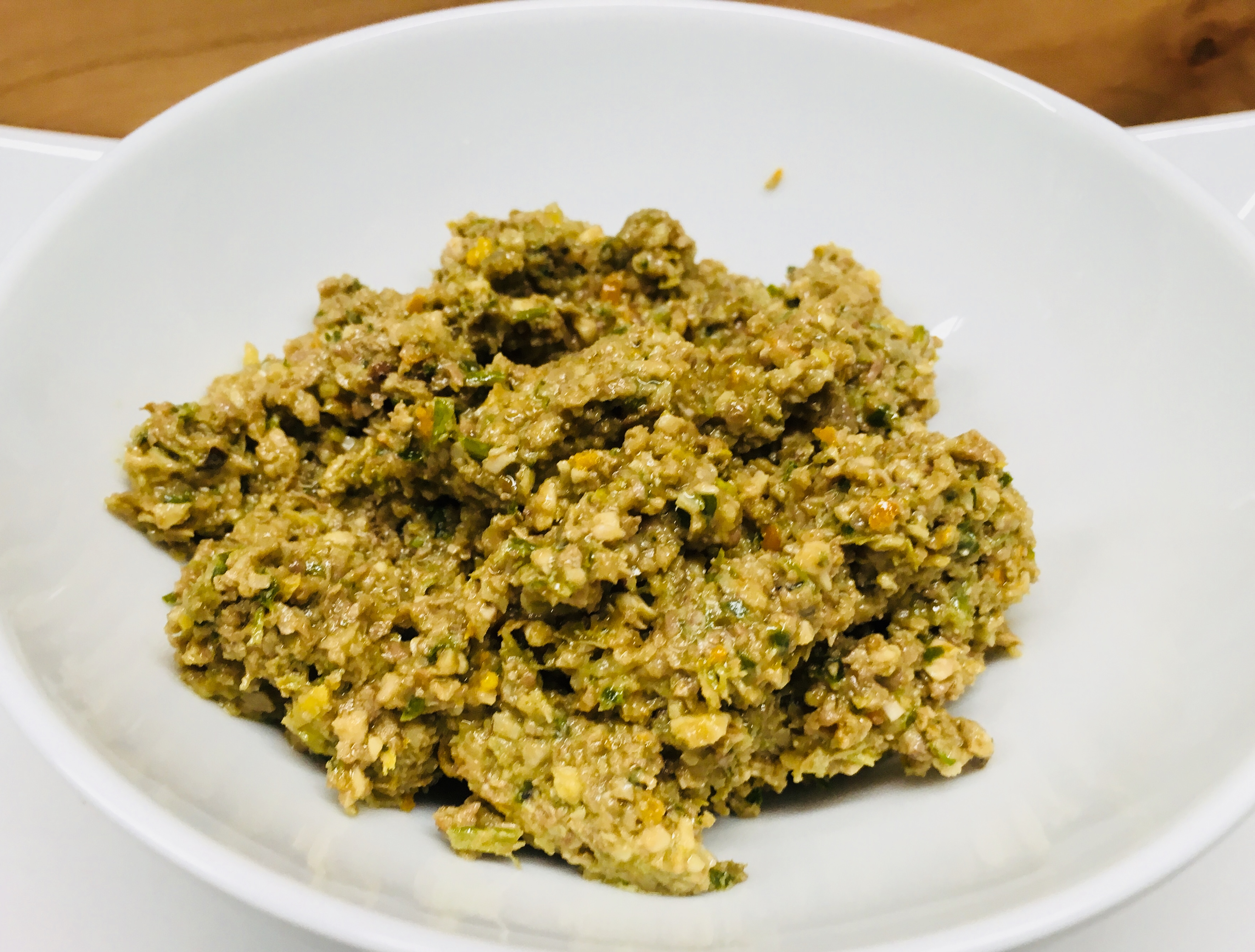 Meine Variante ist aus Oliven, Kapern, Walnüssen, Orangen, Zitronen, Knoblauch und Petersilie. Die Zubereitung ist denkbar einfach. Alle Zutaten in den Mixer und pulsierend zu einer großen Paste verarbeiten. Fertig!
