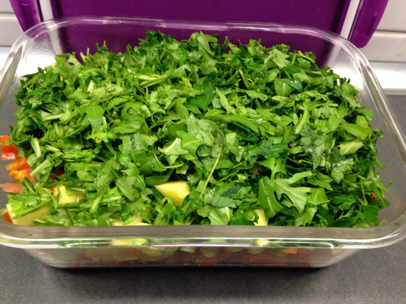 Wer keinen Koriander mag, kann auch Petersilie und oder Ruccula dazugeben. Ich mag alles, daher habe ich auch alles reingetan. Durch den Ruccula wird der gemüsige Salat etwas salatiger und der Ruccula gibt eine zusätzliche Schärfe-Note. Ich finde das passt auch sehr gut.