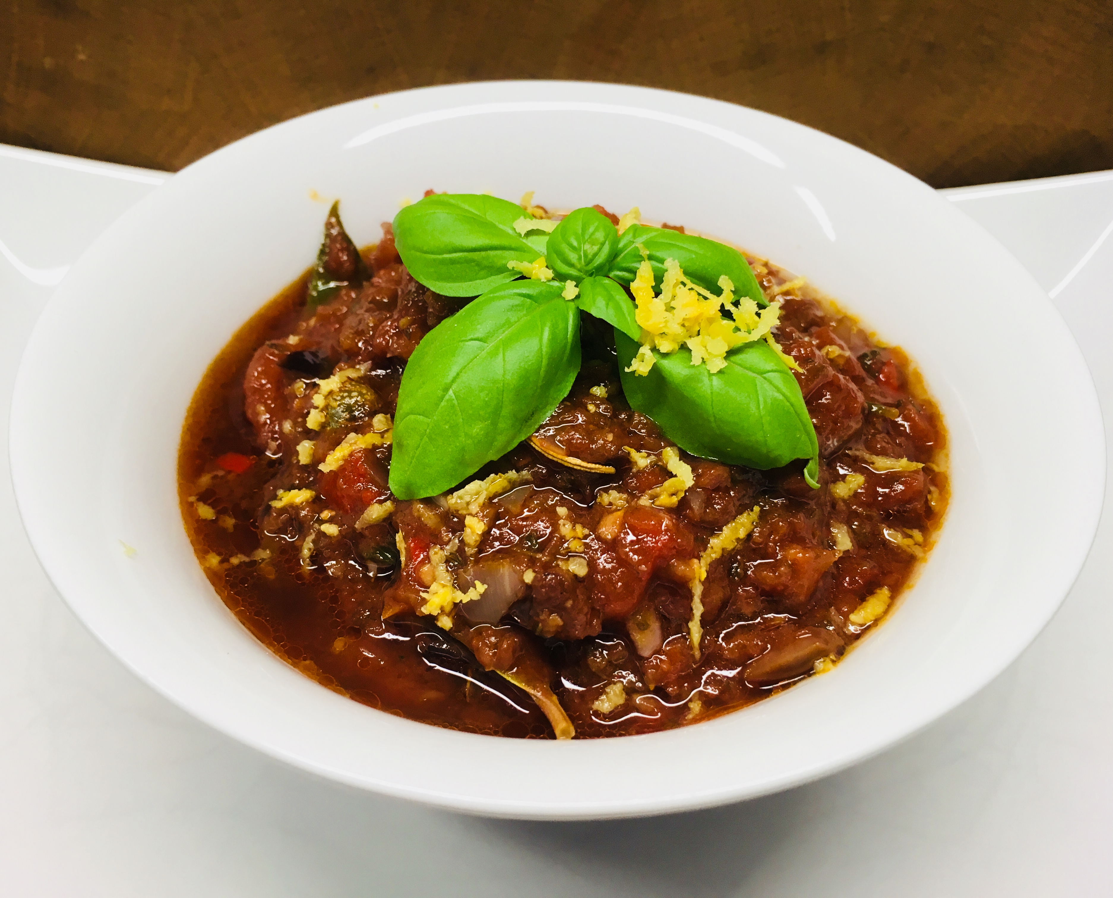 - In der Zwischenzeit Zwiebeln und Knoblauch schälen, Chili entkernen und alles fein hacken und in Olivenöl anschwitzen. Mit Rotwein ablöschen. Dann die gehackten Tomaten und das Tomatenmark, der Zitrone, den Lorbeer, die Kapern und gehackten Oliven und Gewürze dazugeben und ein paar Minuten köcheln lassen.
