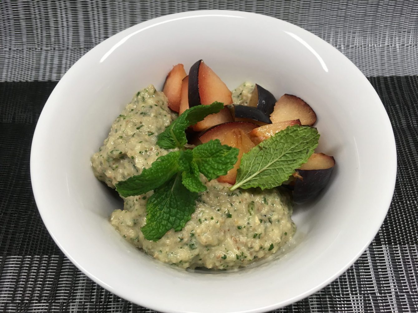 - Die Plaumen mit der Creme vermischen und mit den restlichen Walnüssen und der Minze garniert genießen.