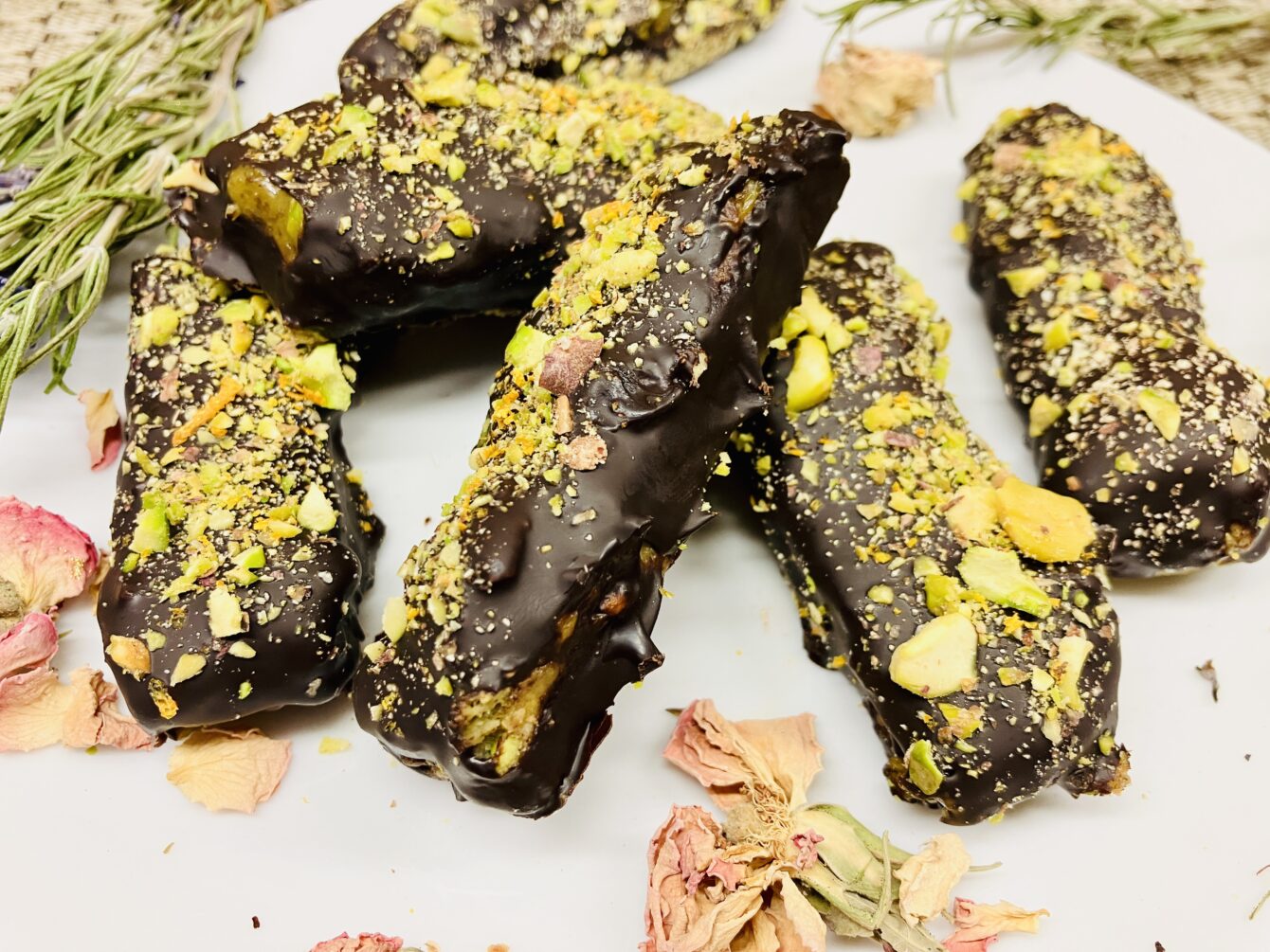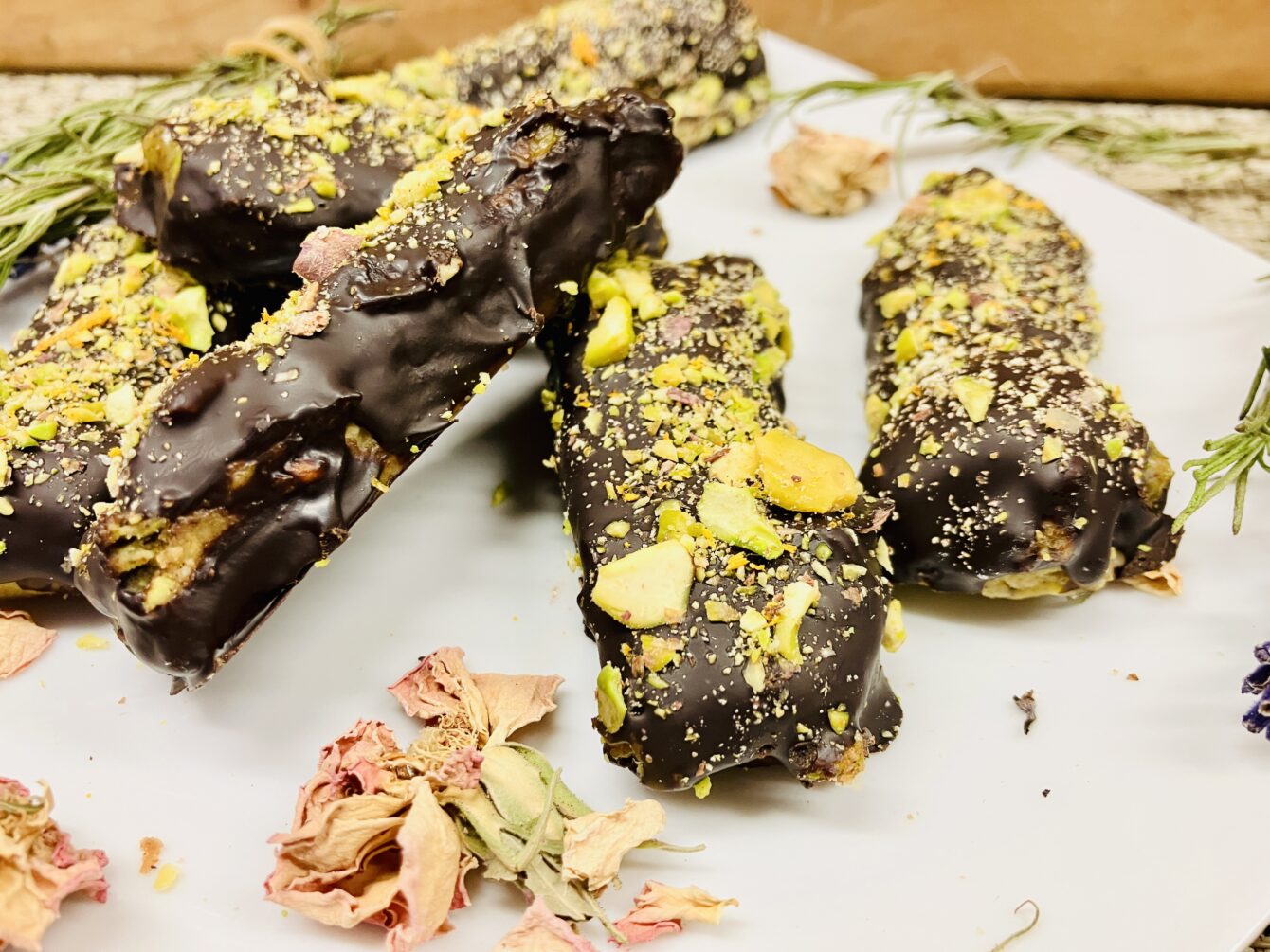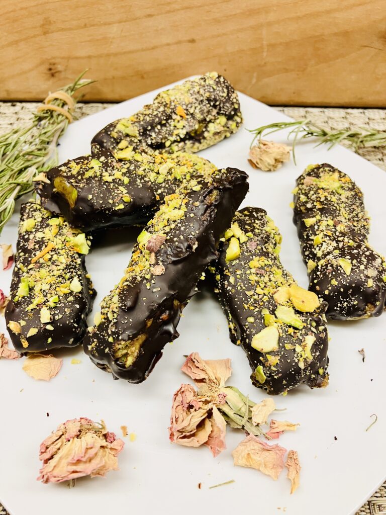 7. Fertigstellen: Die feste Masse in Riegel schneiden. Optional kannst du die Riegel in geschmolzene dunkle Schokolade tauchen und mit gehackten Pistazien und essbarem Gold dekorieren. Vor dem Servieren die Schokolade aushärten lassen.