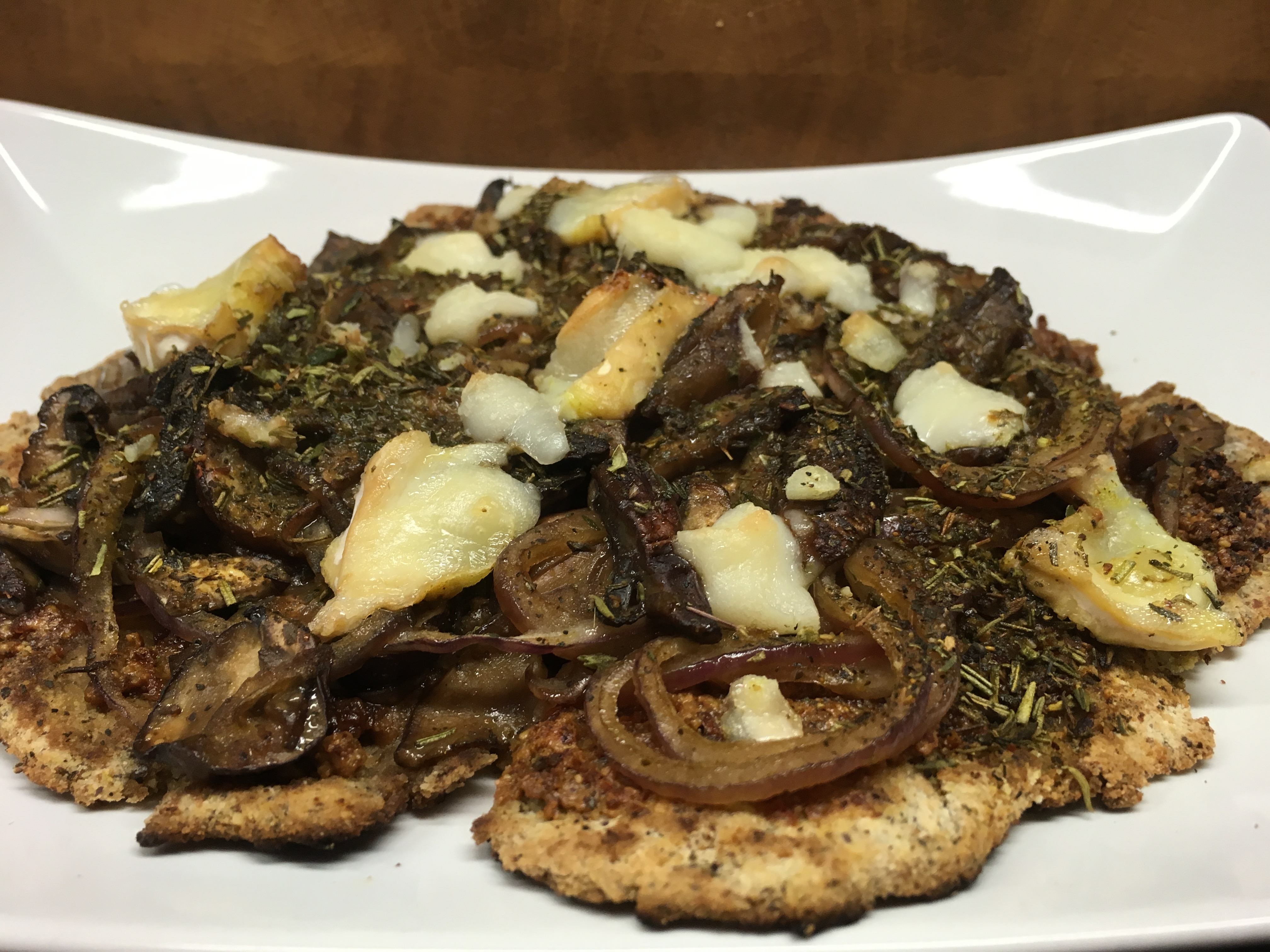 Vegane und glutenfreie Pizza Fladen aus Kokosmehl und Leinsamen als Pizzaboden mit Tomatenpesto und marinierten Champignons und Zwiebel und Ziegenkäse oder veganem Cashew Ricottakäse.