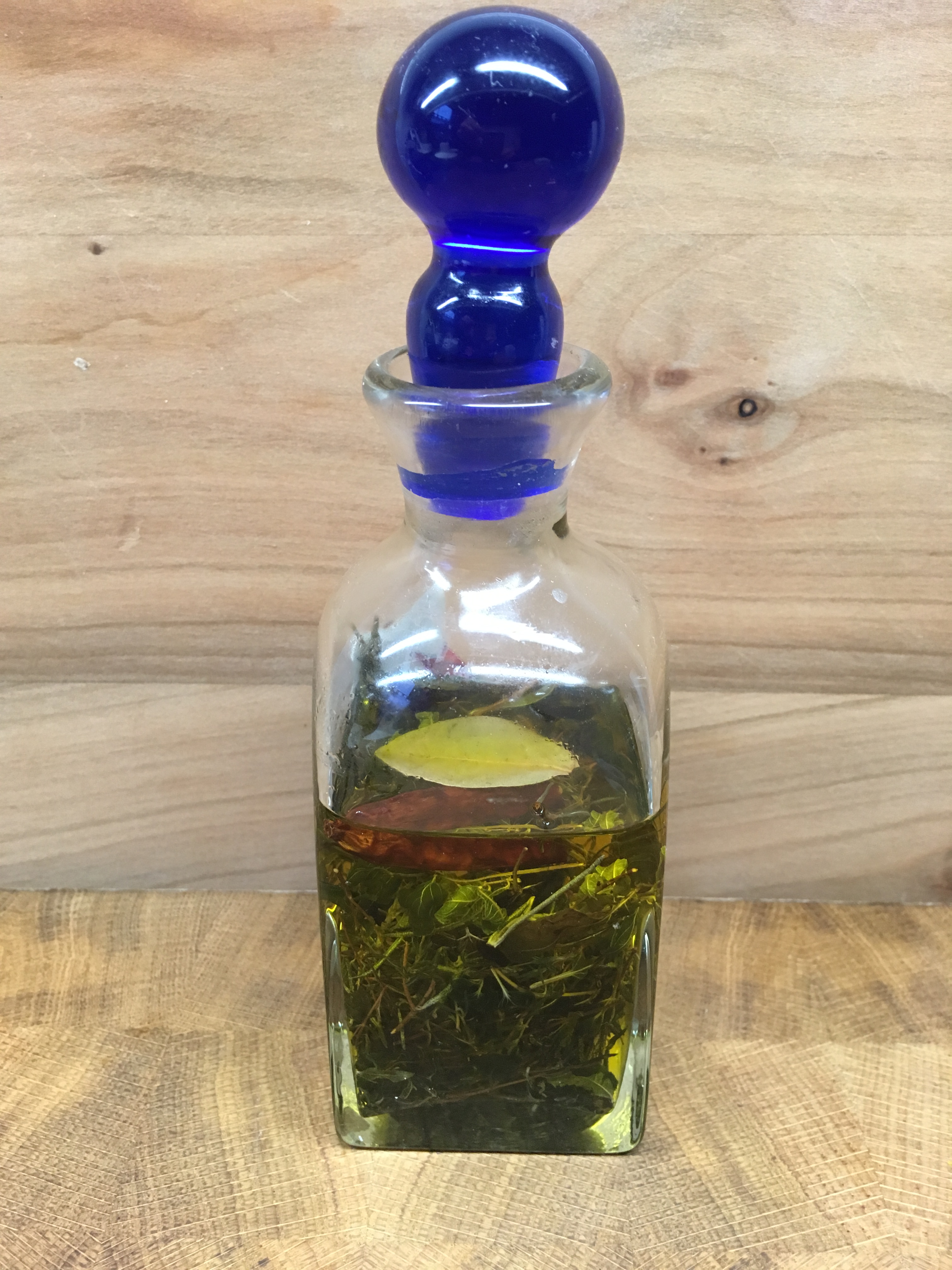 - Gebe 1-2 EL der Gewürzmischung oder der ganzen getrockneten Kräuter in eine Flasche und fülle sie mit Olivenöl.