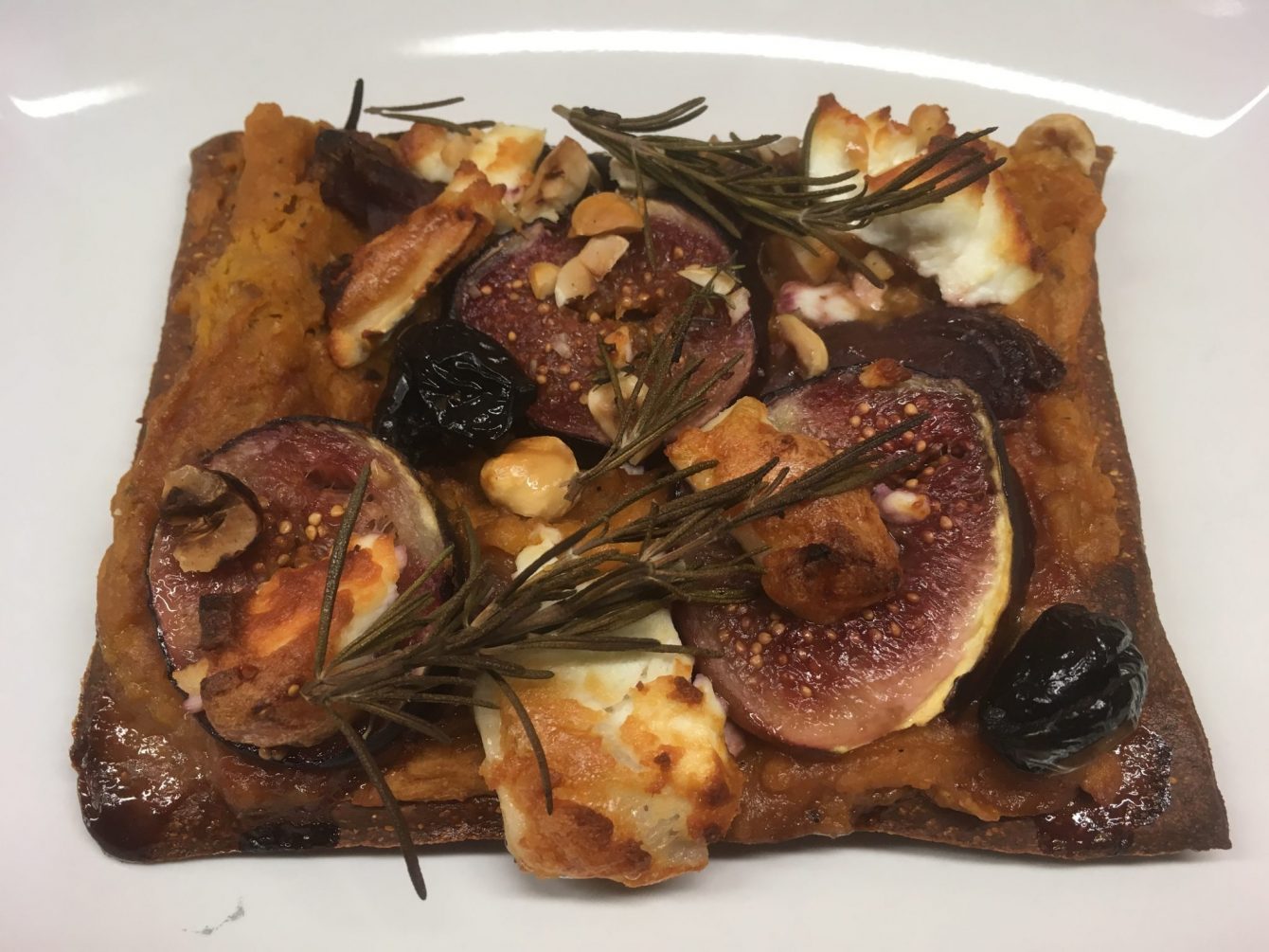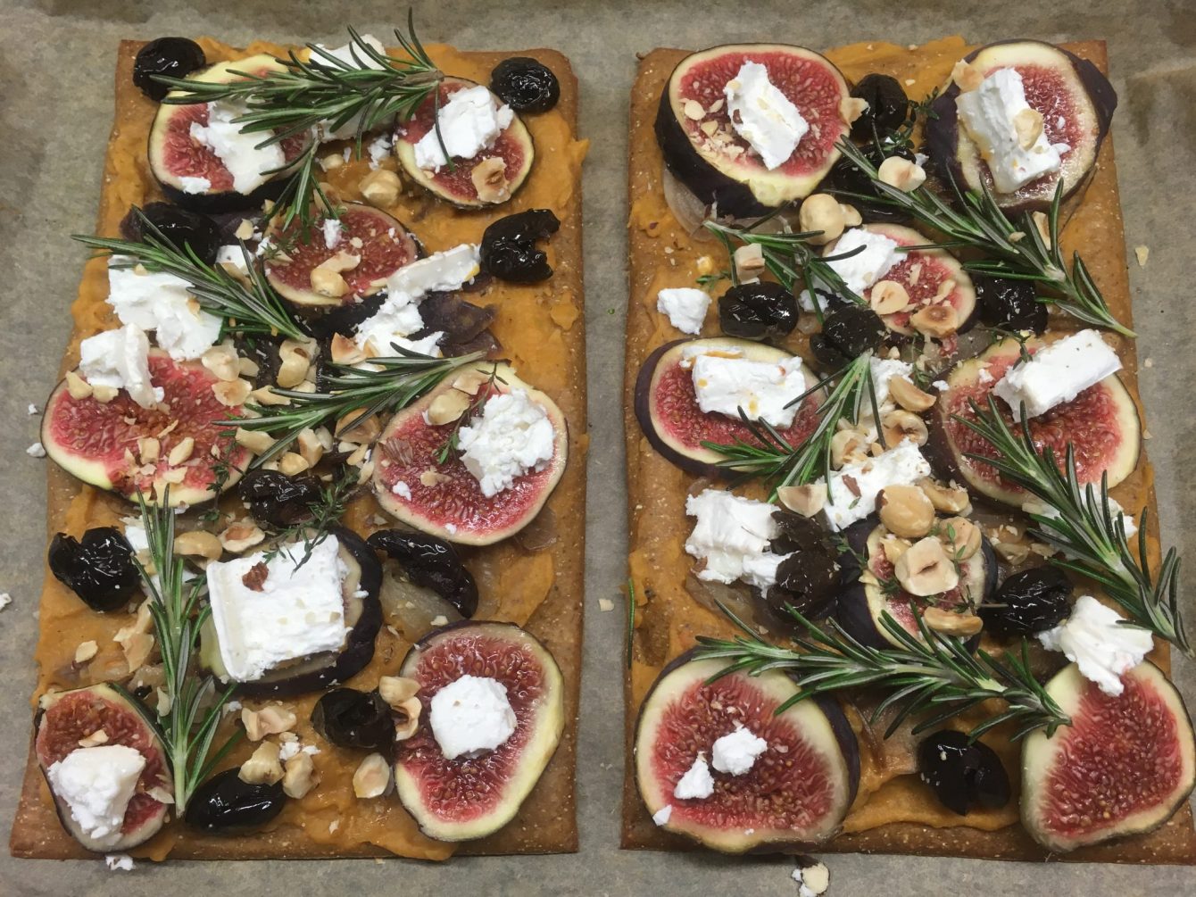 Die glutenfreie Pizza mit Kürbis Creme Sauce, karamelisierten Zwiebeln, Feigen, Haselnüssen, Honig, Ziegenkäse, garniert mit Rosmarin und Thymian belegt.