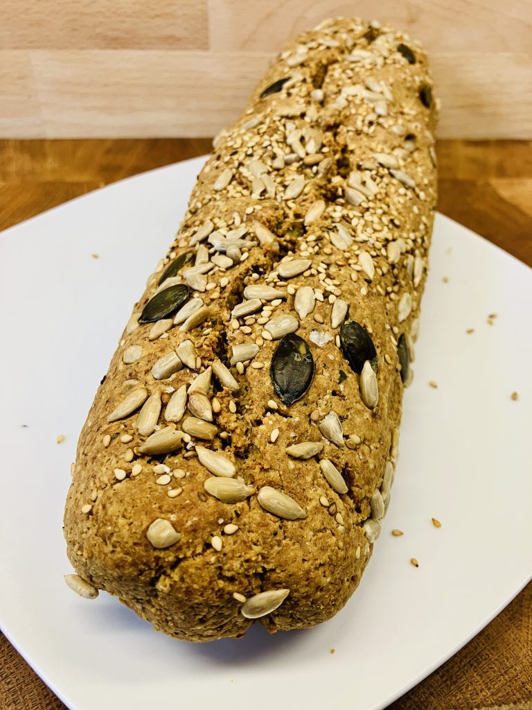 - Die Oberfläche des Baguettes leicht mit Wasser bestreichen und großzügig mit Sonnenblumenkernen, Kürbiskernen und Sesamsamen bestreuen.