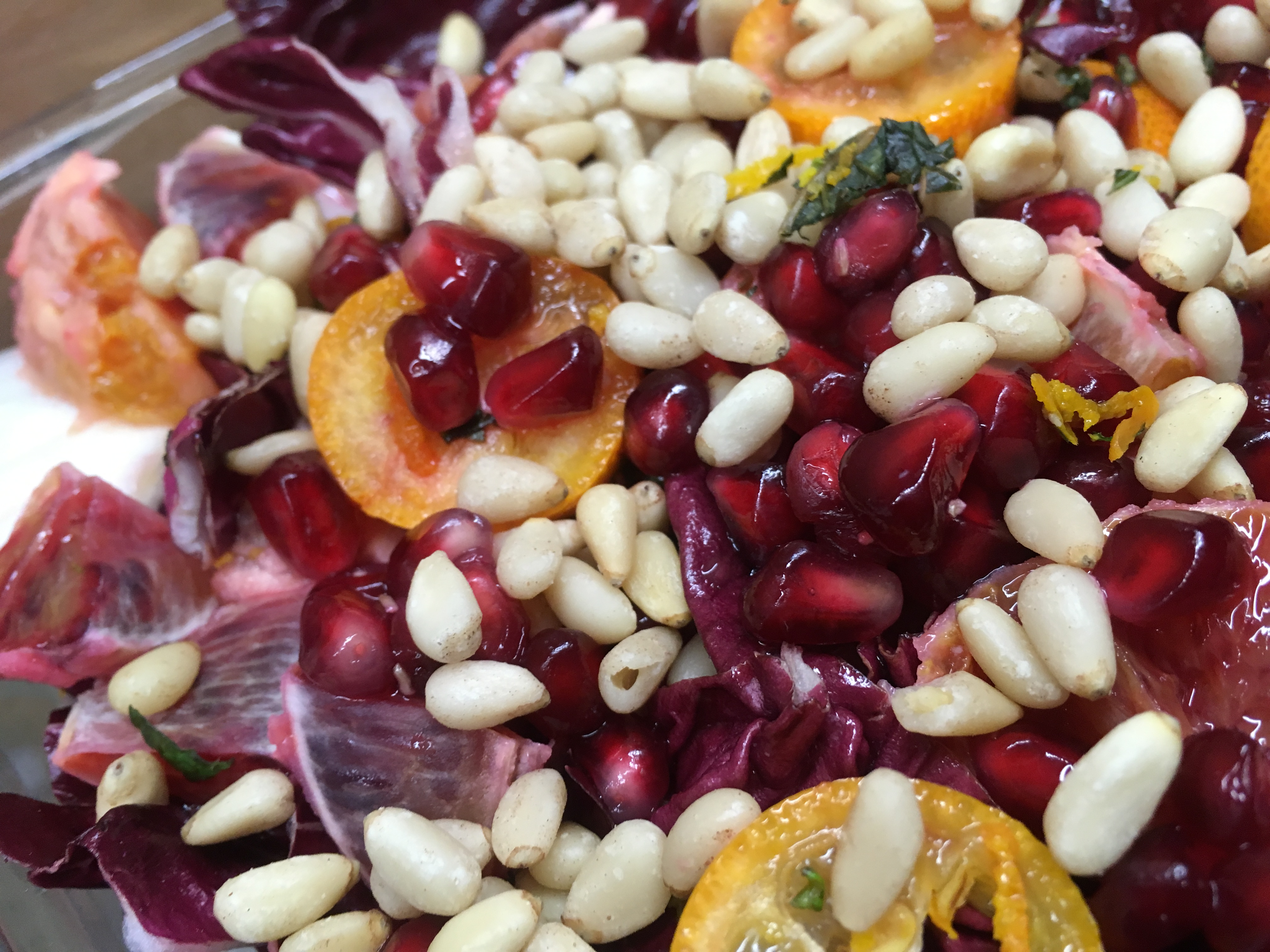 Chicorée und Radicchio sind beides Bittersalate und eignet sich hervorragend zu einer Kombination mit Obst, weil das Bitteraroma sich gut mit der fruchtigen Süße von Früchten kombiniert, in diesem Fall die säuerlich süßen Granatapfelkerne und die süßen Bluorangen. Die bittersüße Kumquat unterstützt den Geschmack.